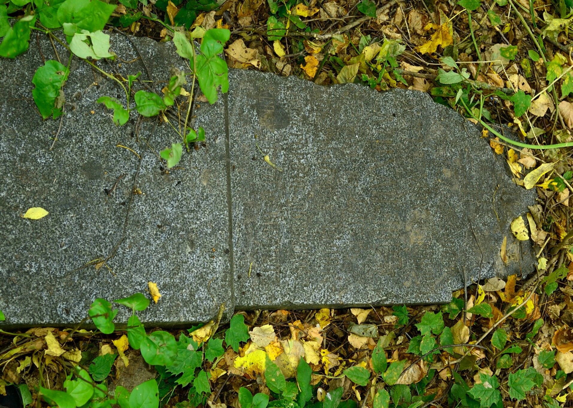 На представленной фотографии запечатлен фрагмент исторического надгробного камня, обнаруженного на территории храма Преображения Господня в селе Жёрновка. Каменная плита серого цвета, разломанная на две части, покоится на земле среди опавшей осенней листвы и сухих ветвей.