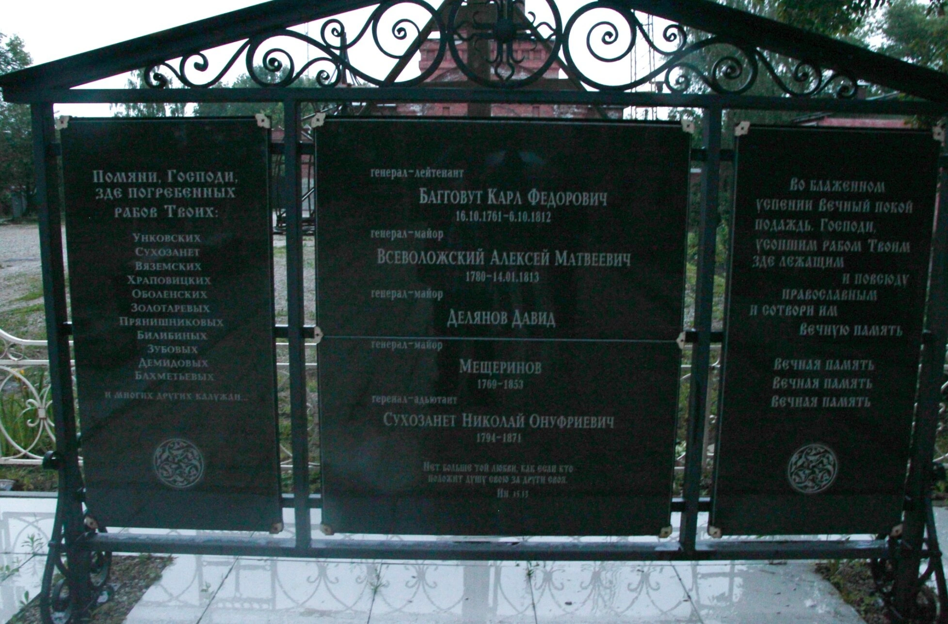 На плите высечены имена и даты жизни усопших православных воинов и представителей известных российских родов, среди которых генерал-лейтенант Карл Фёдорович Багговут, герой Отечественной войны 1812 года, генерал-майор Алексей Матвеевич Всеволожский, генерал от артиллерии Николай Онуфриевич Сухозанет, а также представители родов Унковских, Виземских, Храповицких, Оболенских, Золотарёвых, Прянишниковых, Зубовых и Деляновых.