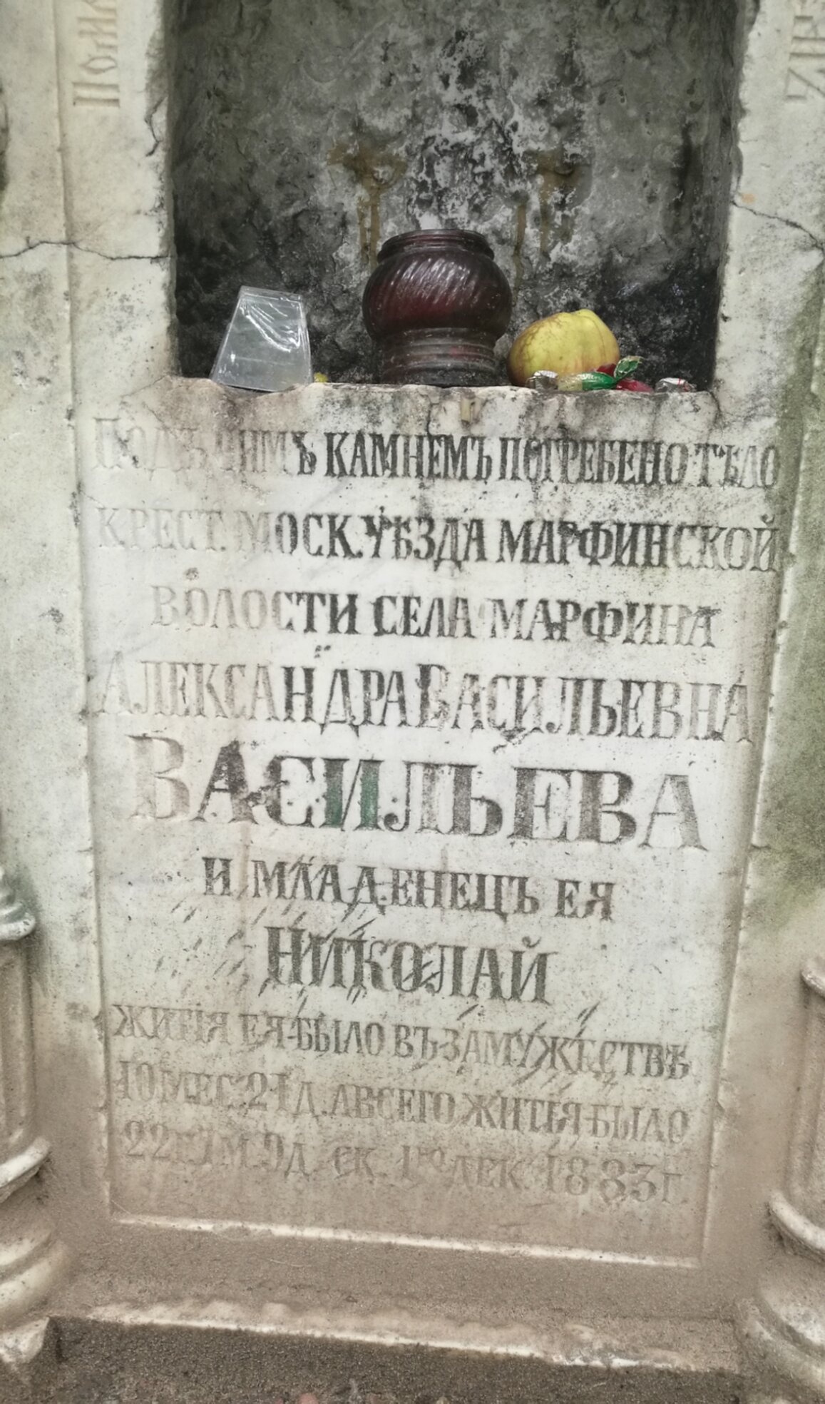 Чётко читаемая эпитафия на лицевой стороне камня гласит: «ПОДЬ СИМЪ КАМНЕМЪ ПОГРЕБЕНО ТЕЛО КРЕСТЬЯНКИ МАРФИНСКОЙ ВОЛОСТИ СЕЛА МАРФИНА АЛЕКСАНДРЫ ВАСИЛЬЕВНЫ ВАСИЛЬЕВОЙ И МЛАДЕНЦА ЕЯ НИКОЛАЯ». Нижняя строка уточняет: «Скончалась 2 января, всего жития было 22 года. Скончалась в 1833 году».