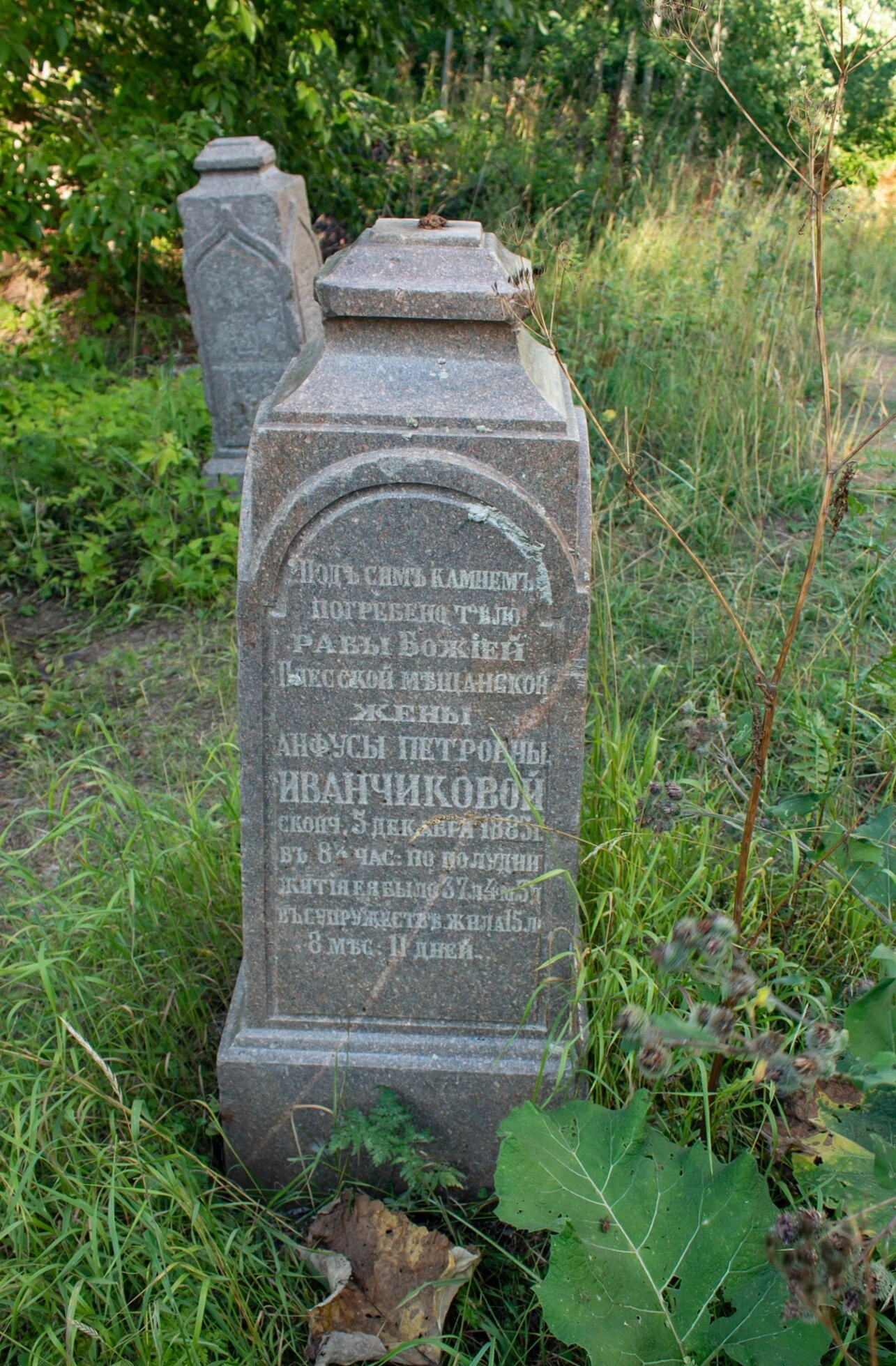 Слева от основного памятника виден фрагмент другого надгробия, что свидетельствует о наличии здесь целого семейного захоронения. Заросшее высокой травой и кустарником место упокоения создаёт атмосферу благоговейной памяти о предках и напоминает о тленности земного бытия. Общий вид фотографии передаёт ощущение священной тишины и забвения, характерное для многих старинных православных кладбищ России.