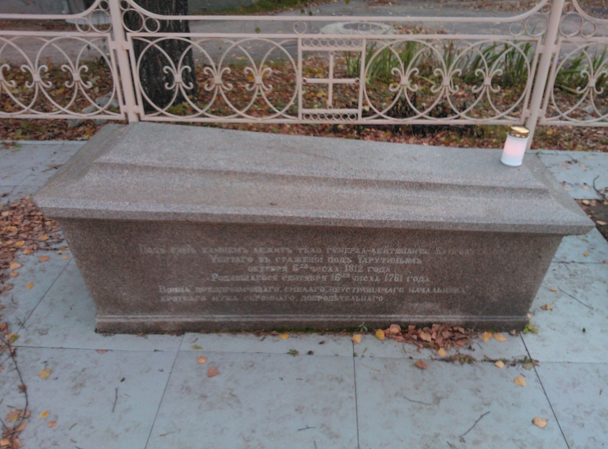 На лицевой поверхности надгробия чётко видна высеченная в камне памятная надпись, гласящая: «ВЪ СТАЖЕ 1812 года 1761 года». Данная эпитафия увековечивает память военачальника, героически погибшего в октябре 1812 года в сражении под Тарутино в ходе Отечественной войны против войск Наполеона. Генерал Багговут был смертельно ранен ядром в начале боя и в тот же день преставился ко Господу.