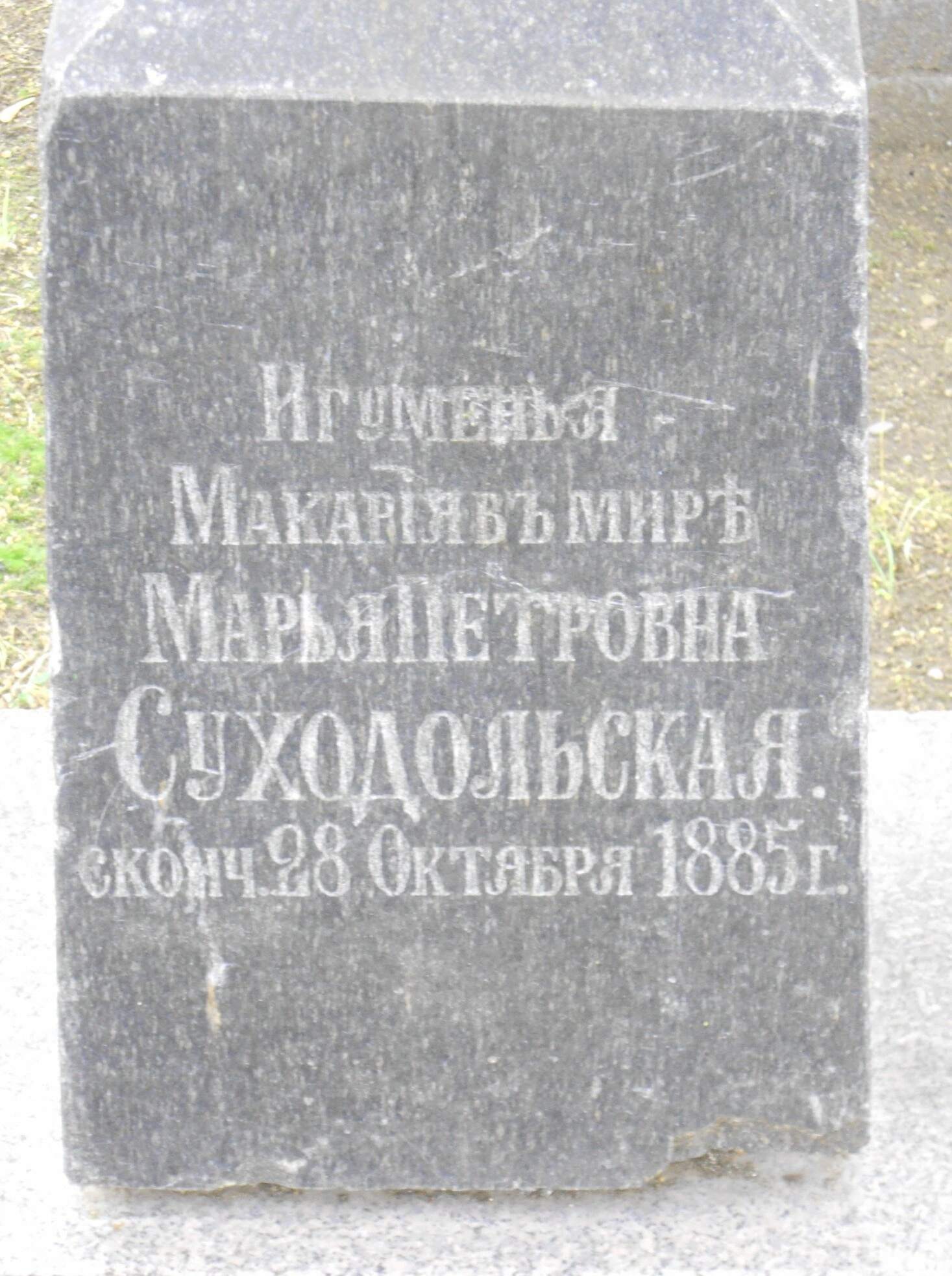 На представленной фотографии запечатлён надгробный камень, установленный на месте упокоения игуменьи Макарии (в миру Марьи Петровны Суходольской) в Смоленском Вознесенском монастыре. Монумент представляет собой вертикальную стелу, выполненную из камня, что соответствует традициям православного мемориального искусства . На лицевой стороне памятника выгравирована эпитафия, содержащая сведения о почившей: её духовный сан, мирское имя и дату кончины — 28 октября 1885 года .
