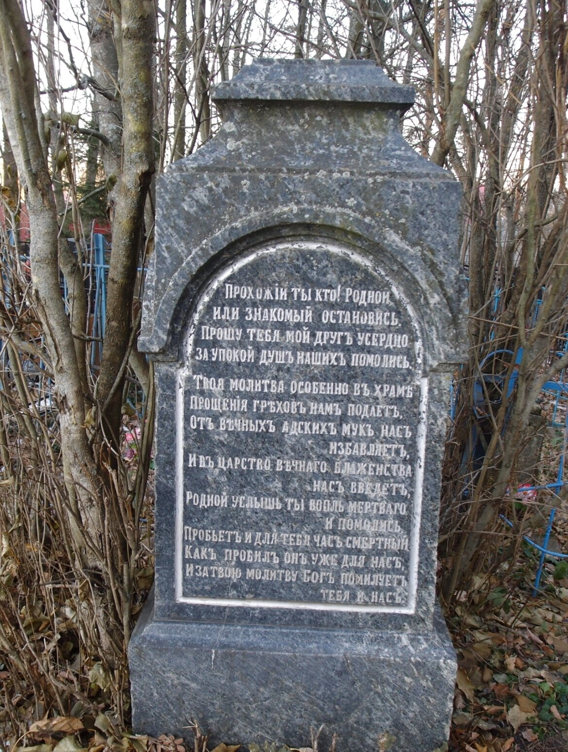 Надгробие выполнено из камня и несёт на себе следы времени, что подчёркивает его историческую ценность. Центральным элементом памятника является высеченная на старославянском языке эпитафия. Текст представляет собой традиционную для православной культуры просьбу к проходящим мимо христианам: «Помолитесь о упокоении раба Божия (имярек)». Эта многовековая традиция призывает живых к молитвенной памяти об усопших, что является духовной милостыней и выражением христианской любви.