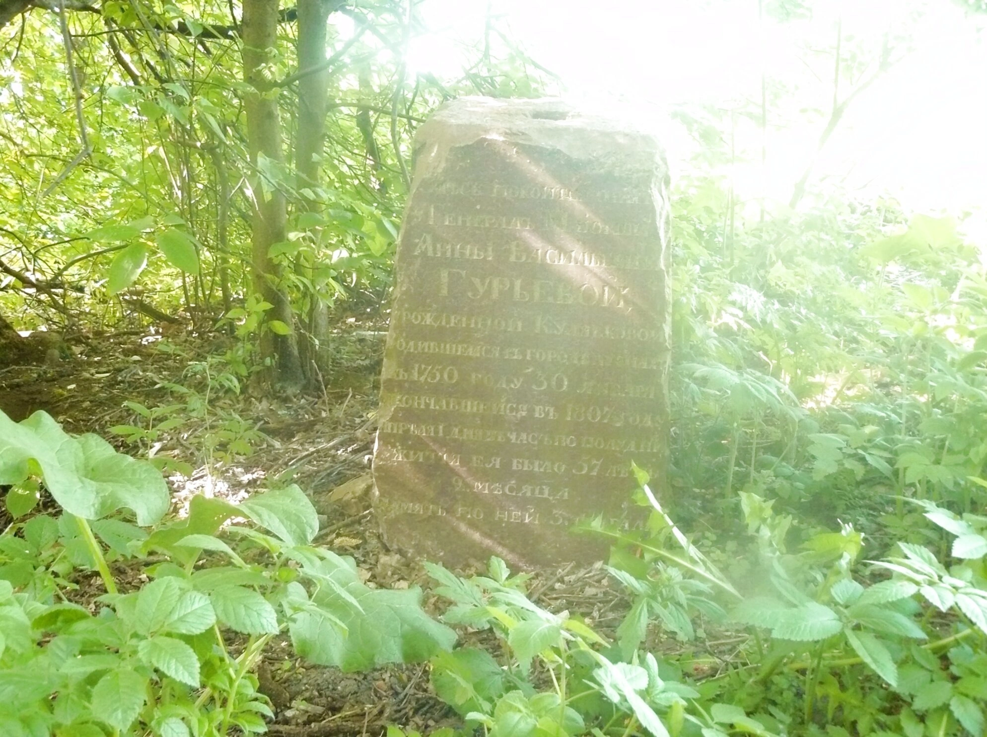 На представленной фотографии запечатлен старинный каменный надгробный памятник, расположенный в лесной местности на территории бывшего приходского кладбища у Церкви во имя святых мучеников Гурия, Самона и Авива в селе Трехсвятское Калужской области.