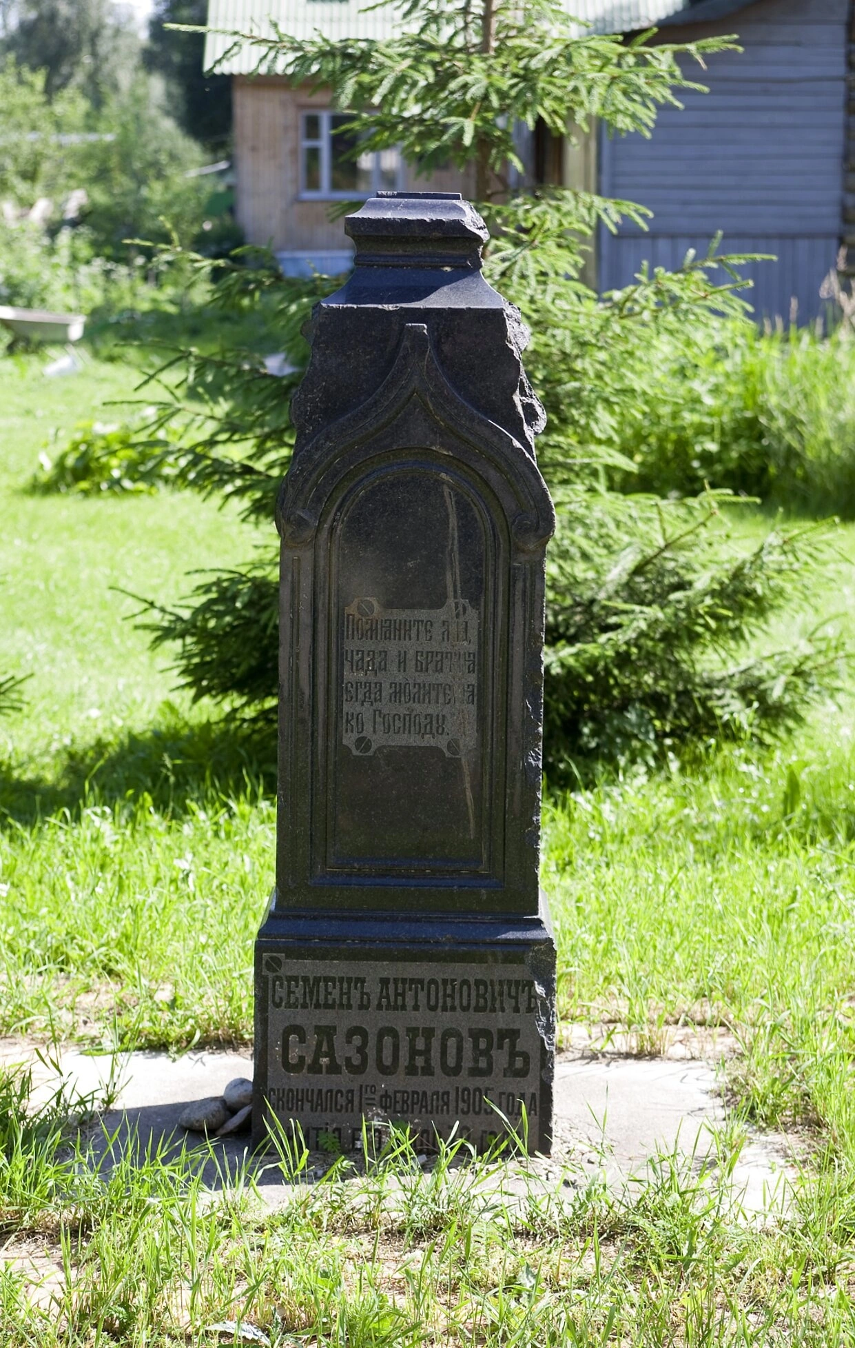 На представленной фотографии запечатлён старинный надгробный памятник, выполненный в форме строгого обелиска. Монумент установлен на ухоженной территории, окружённой зеленью, в непосредственной близости от храма. По географическим координатам и данным категории Wikimedia Commons точно установлено, что данный памятник находится на церковном кладбище у Церкви Алексия, митрополита Московского, что в городе Хотьково Московской области.