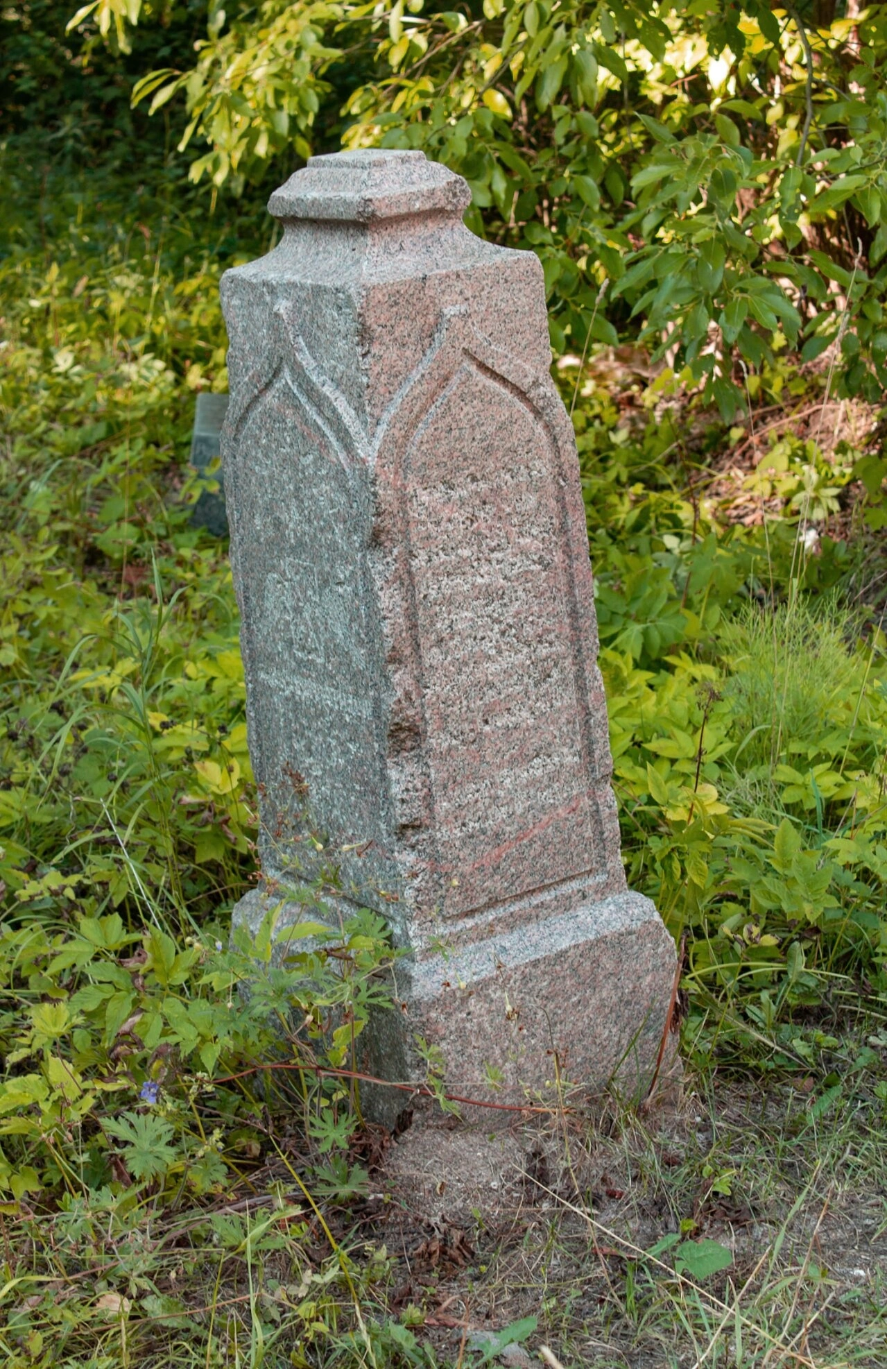 Время оставило на святом памятнике свои следы: камень потемнел от лет и непогоды, заметны признаки естественной эрозии. Надгробие слегка склонилось набок, что придает ему особую душевную трогательность. Окружающая обильная растительность – густая зелёная трава, кустарники и деревья на заднем плане – создаёт атмосферу умиротворённого покоя, свойственную старинным православным погостам.