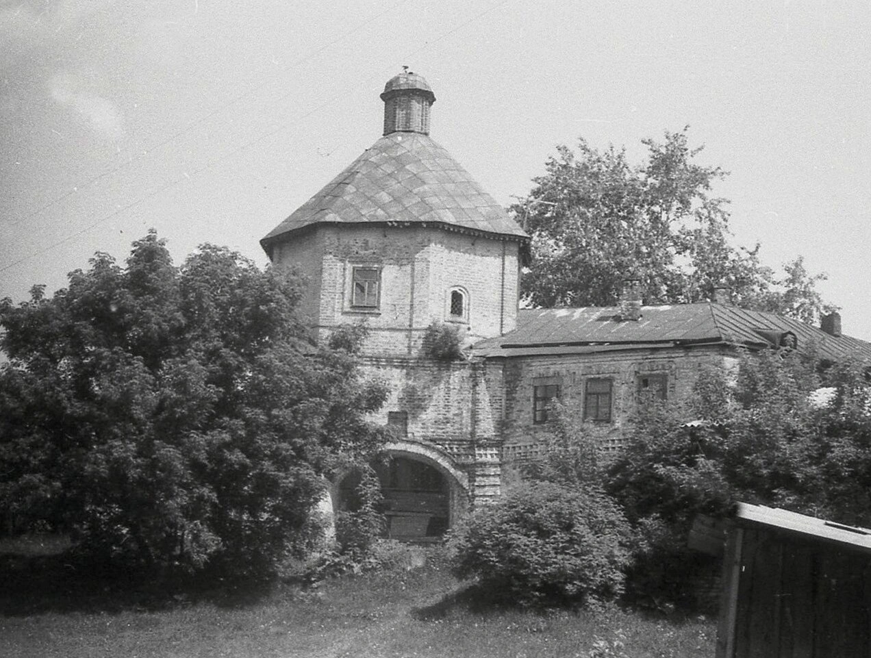 На представленной фотографии запечатлена надвратная церковь во имя святого великомученика Феодора Стратилата, входящая в комплекс Свято-Троицкого мужского монастыря города Чебоксары. Снимок был сделан в 1970-х годах, запечатлев уникальный памятник церковной архитектуры в его историческом виде.
