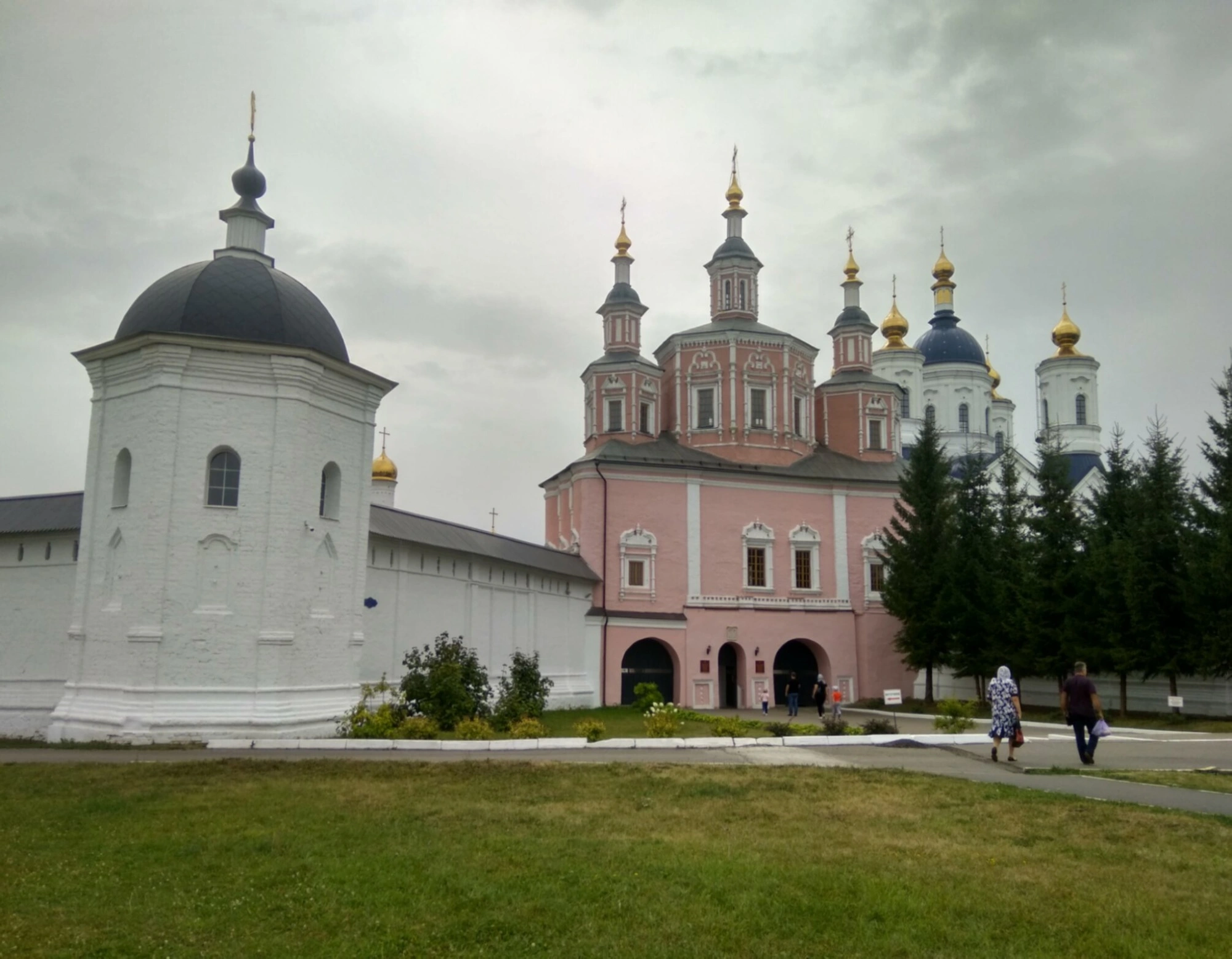 Передний план фотографии занимает ухоженный зелёный газон с цветочными клумбами, справа поднимаются стройные хвойные деревья. На дорожке, вдали от зрителя, можно заметить две фигуры людей, что подчёркивает масштаб сооружений и оживляет панораму. Небо в день съёмки покрыто серыми облаками, создавая сдержанное, contemplative настроение, соответствующее атмосфере святого места.