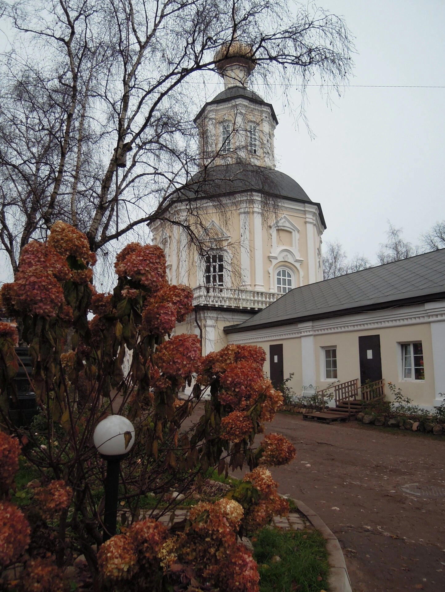 Белоснежный храм с лазурными куполами, увенчанными золочеными крестами, величественно возвышается над монастырской стеной. На снимке хорошо просматривается стройная шатровая колокольня, являющаяся неотъемлемой частью архитектурного облика церкви. Осенняя пора, запечатленная на фотографии, придает пейзажу особое настроение умиротворения и тишины. Оголенные ветви деревьев и кусты с соцветиями свидетельствуют о поздней осени, а пасмурное небо напоминает о тленности земной жизни и устремленности к горнему миру.
