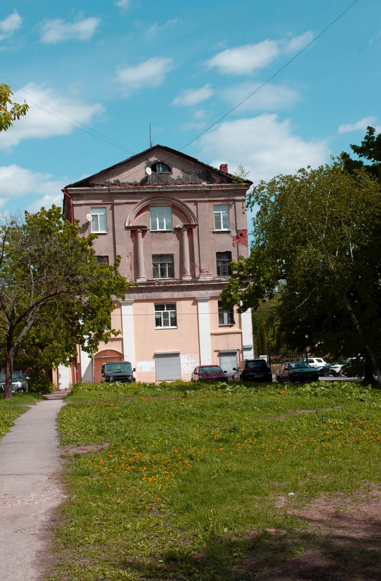 На представленной фотографии запечатлена историческая постройка, имеющая особое значение для православного наследия Рязани – бывшая надвратная церковь-колокольня во имя святой великомученицы Варвары, принадлежавшая Казанскому Явленскому женскому монастырю. Ныне здание, расположенное по адресу улица Фурманова, 58, утратило своё первоначальное религиозное назначение и приспособлено под жилой дом.