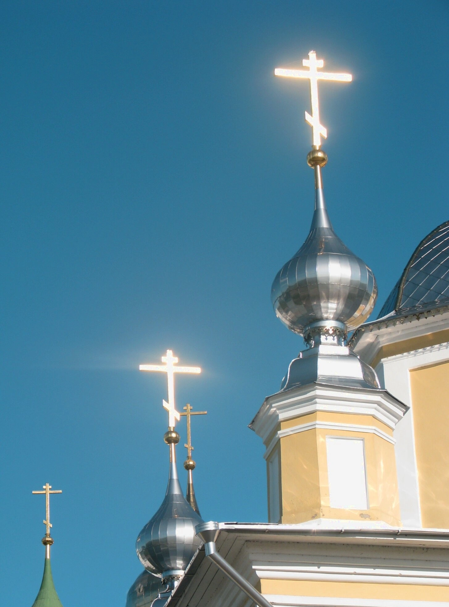Два купола храма, выполненные в традиционной для православного зодчества луковичной форме, покрыты материалом с характерным металлическим блеском. На центральном куполе установлен православный крест с дополнительной перекладиной, который ярко освещён солнечными лучами. Второй купол, расположенный на колокольне, также увенчан аналогичным крестом, что создает гармоничную композицию.