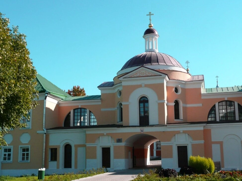 Святыня была возведена в период с 1800 по 1805 годы. Архитектурный облик церкви, выдержанный в стиле классицизма, отличается благородной строгостью. Здание гармонично сочетает желтые оштукатуренные стены с белыми декоративными элементами и увенчано куполом тёмного цвета, над которым возвышается православный крест. Особенностью храма является его композиция: он встроен в монастырскую ограду, а через его массивную арку в нижнем ярусе проходит дорога, ведущая на территорию обители. С южной и северной сторон к церкви примыкают корпуса, что формирует целостный и монументальный архитектурный комплекс.