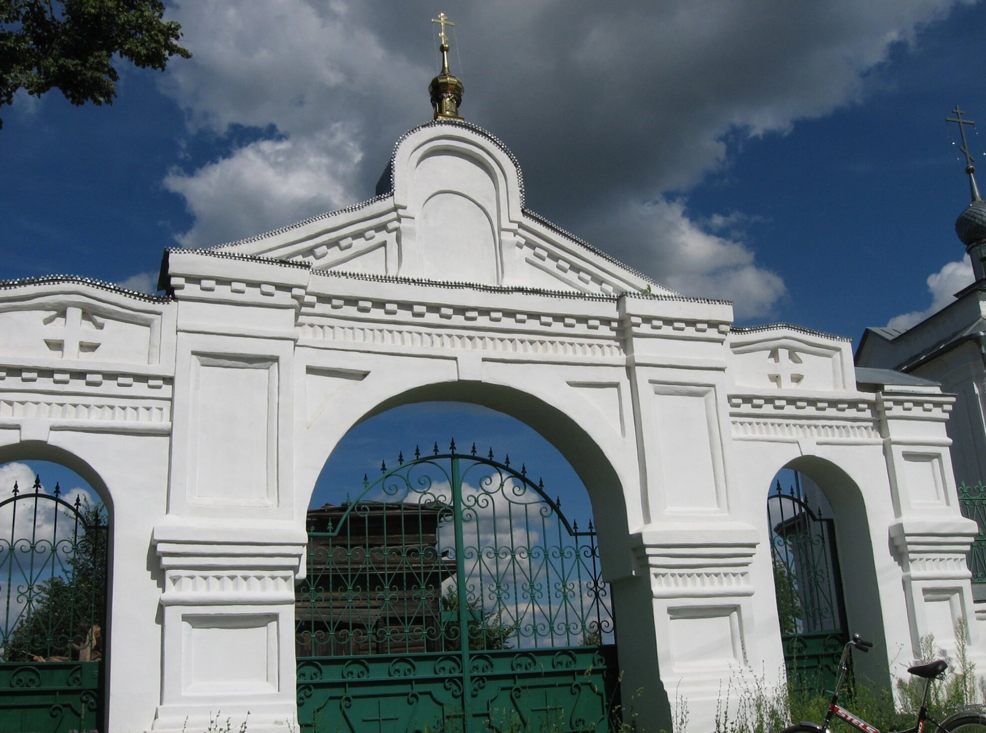 Церковь выкрашена в благолепный белый цвет, что создаёт выразительный контраст с зелёными вратами и лазурью небес. Справа от храма просматривается фрагмент другого монастырского строения с куполом, вероятно, одной из церквей обители. На переднем плане фотографии заметна скромная монастырская растительность, а у стены - припаркованный велосипед, что добавляет кадру элемент повседневной жизни.