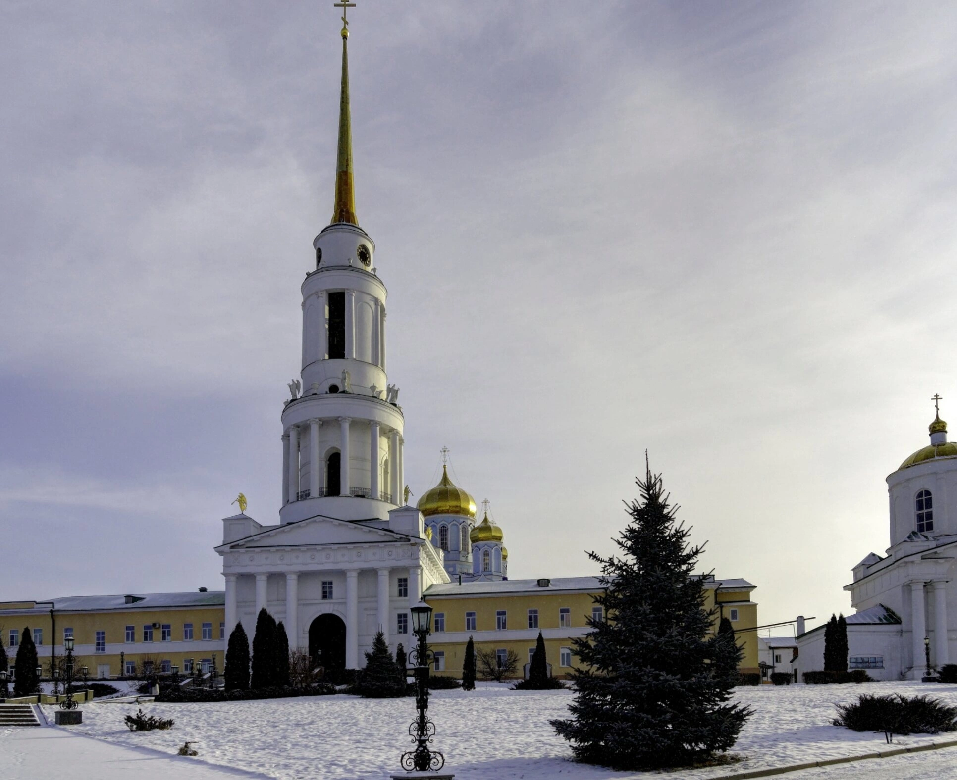 На фотографии запечатлена надвратная колокольня с церковью во имя святителя Николая Мирликийского — западный вход и архитектурная доминанта Задонского Рождество-Богородицкого мужского монастыря. Это сооружение, возведенное в 1824–1837 годах по проекту воронежского губернского архитектора И.А. Блицына, является выдающимся памятником архитектуры зрелого классицизма и объектом культурного наследия федерального значения.