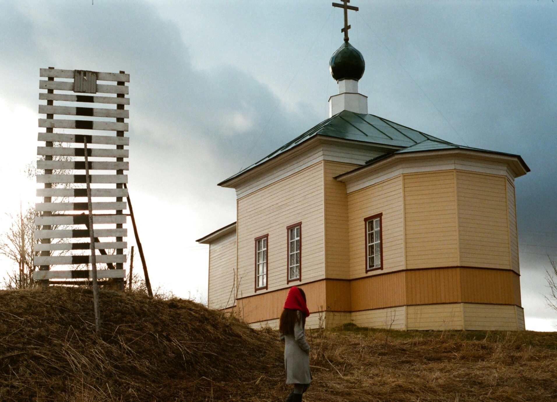 На переднем плане фотографии видна фигура человека в красном платке и сером пальто, стоящего спиной к зрителю. Этот персонаж придаёт снимку особый масштаб и позволяет оценить монументальность церковного сооружения. Пасмурная погода с тяжелыми облаками создаёт атмосферу северной строгости и подчёркивает аутентичность места.