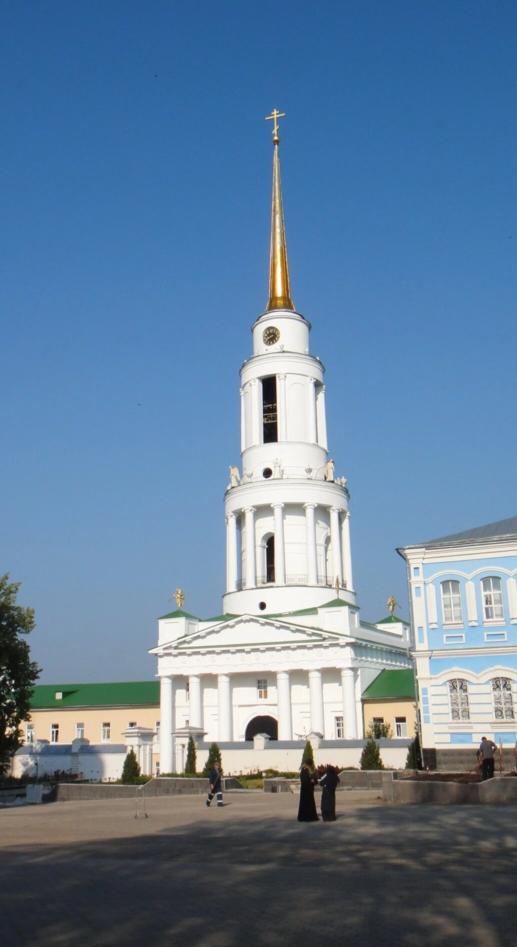 За колокольней, гармонично вписываясь в небесную линию, просматривается могучий купол и кресты пятиглавого Владимирского собора, построенного в XIX веке в русско-византийском стиле. Собор, освящённый в честь Владимирской иконы Божией Матери, является духовным сердцем монастыря и хранит главную его святыню. Снимок передаёт благолепие и строгую красоту монастырской архитектуры, выдержанной в классическом стиле. Белоснежные стены и златоглавые купола, устремлённые ввысь, символизируют собою молитву и духовное устремление к Горнему миру. Монастырь, основанный в XVII веке, имеет богатейшую историю и славится своим прошлым, связанным с именем святителя Тихона Задонского, чьи мощи почивают в соборном храме. Фотография позволяет зрителю ощутить атмосферу благодати и величия этой намоленной земли, являющейся местом непрестанного паломничества верующих со всей России.