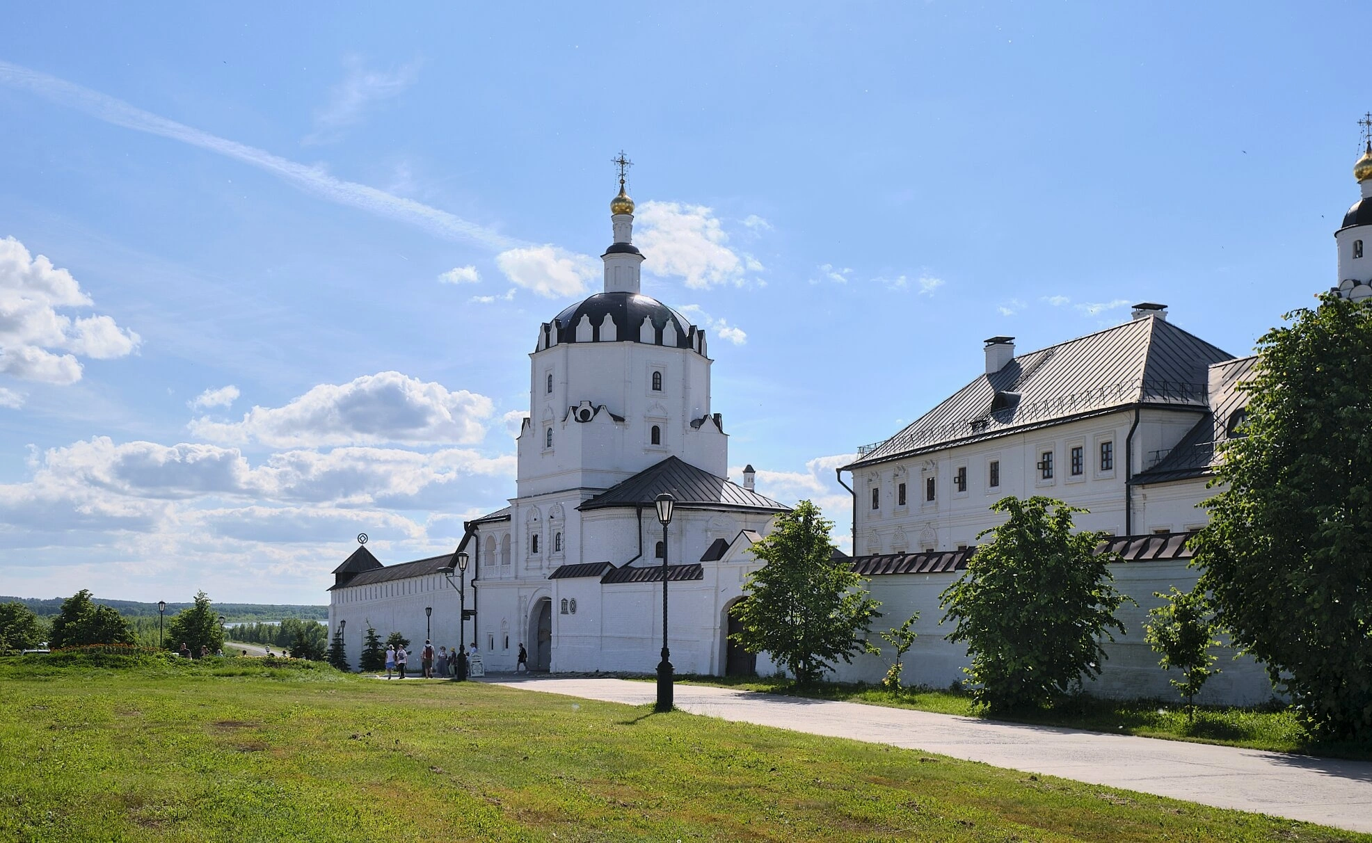 Фотография сделана с некоторого расстояния, с уровня земли. На переднем плане открывается вид на ухоженный зелёный газон и асфальтированную дорожку, ведущую к святым вратам монастыря. Вдали, за стенами обители, простирается пейзаж с деревьями и возможной водной гладью, напоминая о островном расположении Свияжска. Небо в момент съёмки ясное, голубое, с лёгкими белыми облаками, что указывает на летний день.