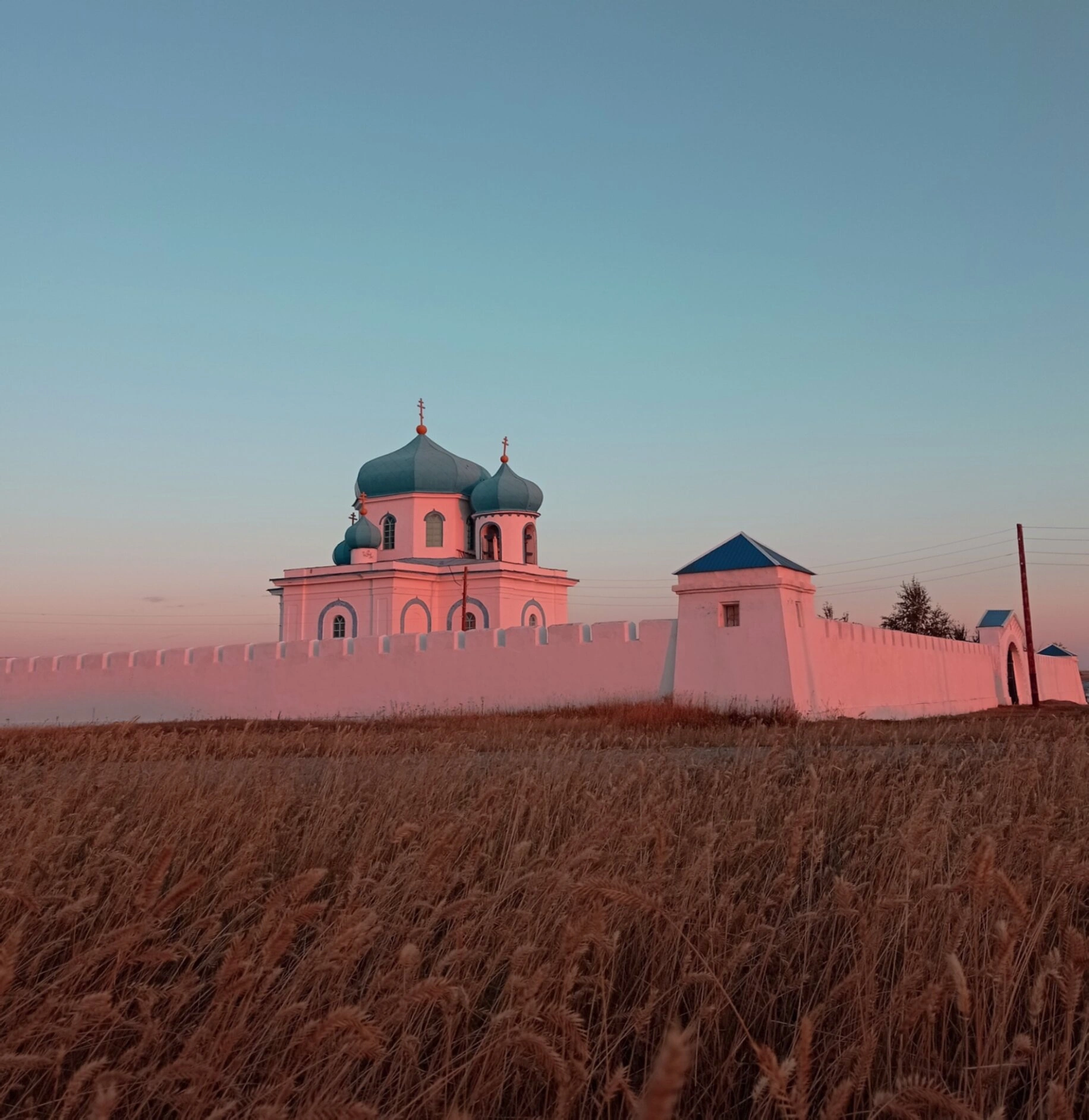 На фотографии запечатлён уникальный памятник истории и культуры XIX века — храм во имя святого благоверного князя Александра Невского, расположенный в селе Наследницком Брединского района Челябинской области. Белоснежный православный храм с лазурными куполами, увенчанными золочёными крестами, возвышается посреди бескрайней степи, будучи окружённым мощной крепостной стеной. Этот ансамбль является частью Наследницкой крепости, основанной оренбургскими казаками в 1830-х годах для защиты юго-восточных рубежей Российской империи.