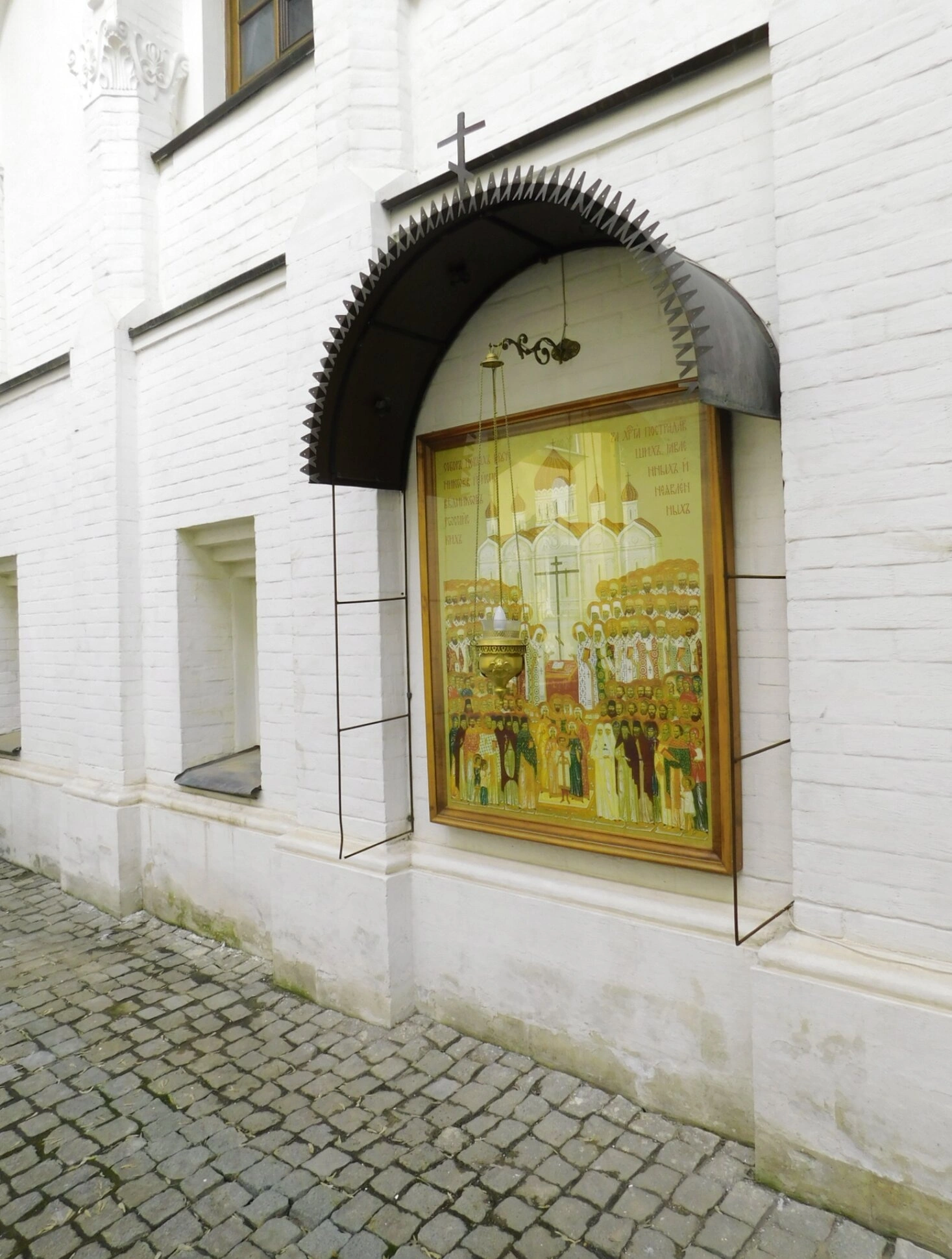 На фотографии запечатлена большая настенная икона (или фреска), расположенная на внешней стене одного из храмов Новоспасского ставропигиального мужского монастыря в Москве. Священное изображение размещено в специальной арочной нише, что является традиционным элементом оформления православных монастырских построек. Ниша увенчана защитным металлическим козырьком с декоративным зубчатым краем, предохраняющим святыню от осадков, а над ней установлен небольшой восьмиконечный православный крест, символизирующий искупительную жертву Христа.