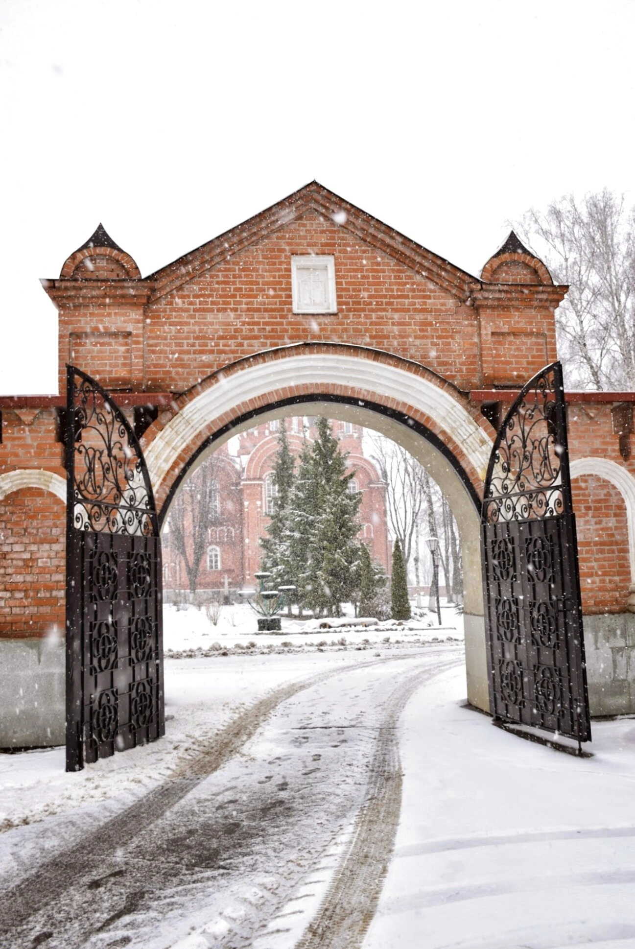 На представленном снимке запечатлены Небесные врата, являющиеся западным въездом в историческую усадьбу Узкое. Суровая красота зимнего дня открывается взору: ажурные створки из чёрного кованого металла покоятся в арочном проёме, сложенном из тёплого красного кирпича. Снег, тихо падающий с небес, покрывает белым покровом землю, дорожные колеи и вековые деревья парка, виднеющиеся в просвете между створок. На заднем плане угадываются очертания главного усадебного дома под зелёной кровлей.