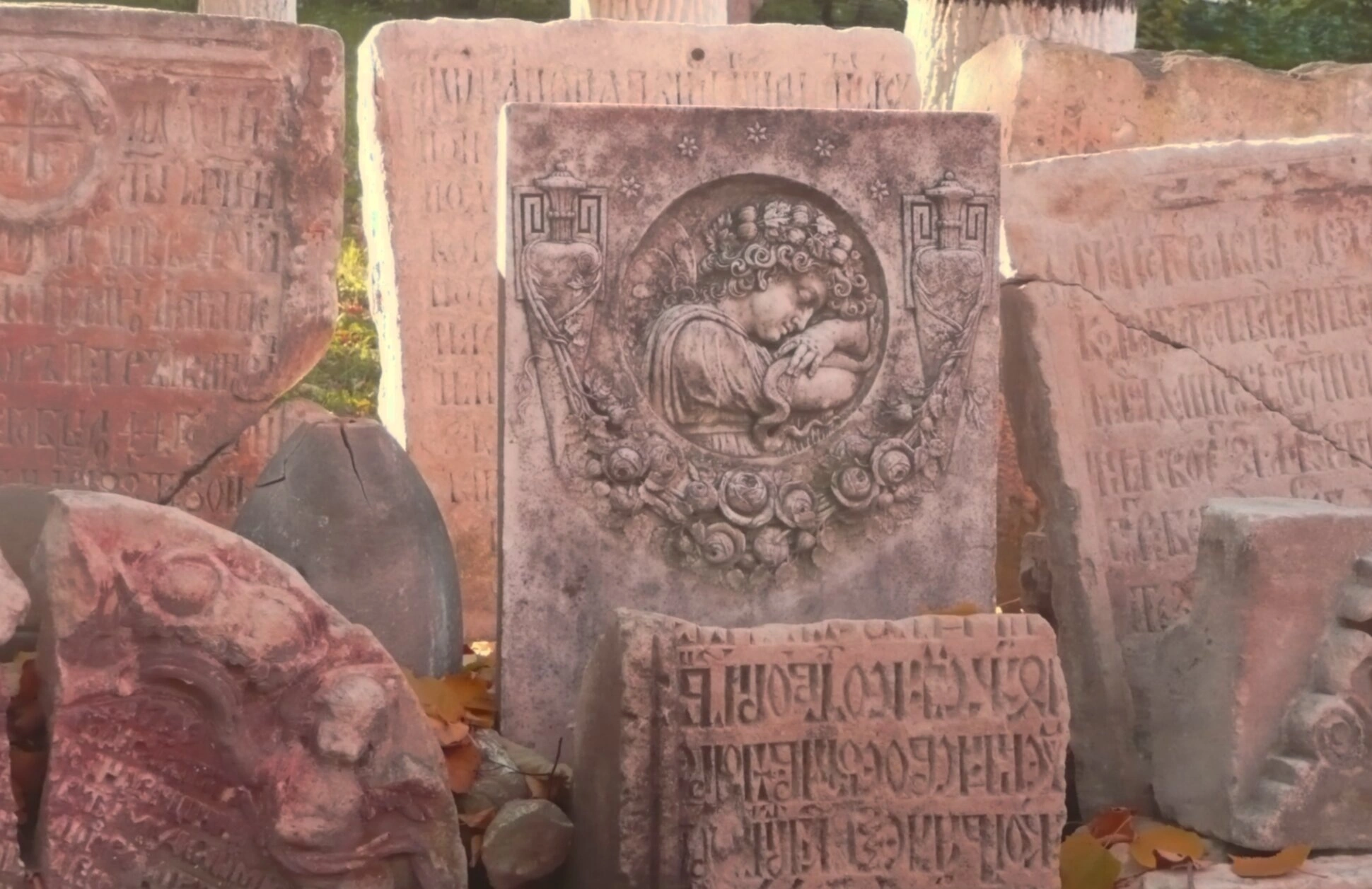 В центре композиции изображено вертикальное каменное надгробие, вероятно, датируемое XVIII или XIX веком. На его лицевой части различимо рельефное изображение в круглом медальоне, традиционное для православной погребальной культуры. Окружающие памятник массивные каменные плиты и саркофаги, покрытые патиной времени, несут на себе следы древних орнаментов и полустёртые временем надписи, выполненные в основном на церковнославянском языке. Эти эпиграфические памятники представляют огромную историческую ценность.