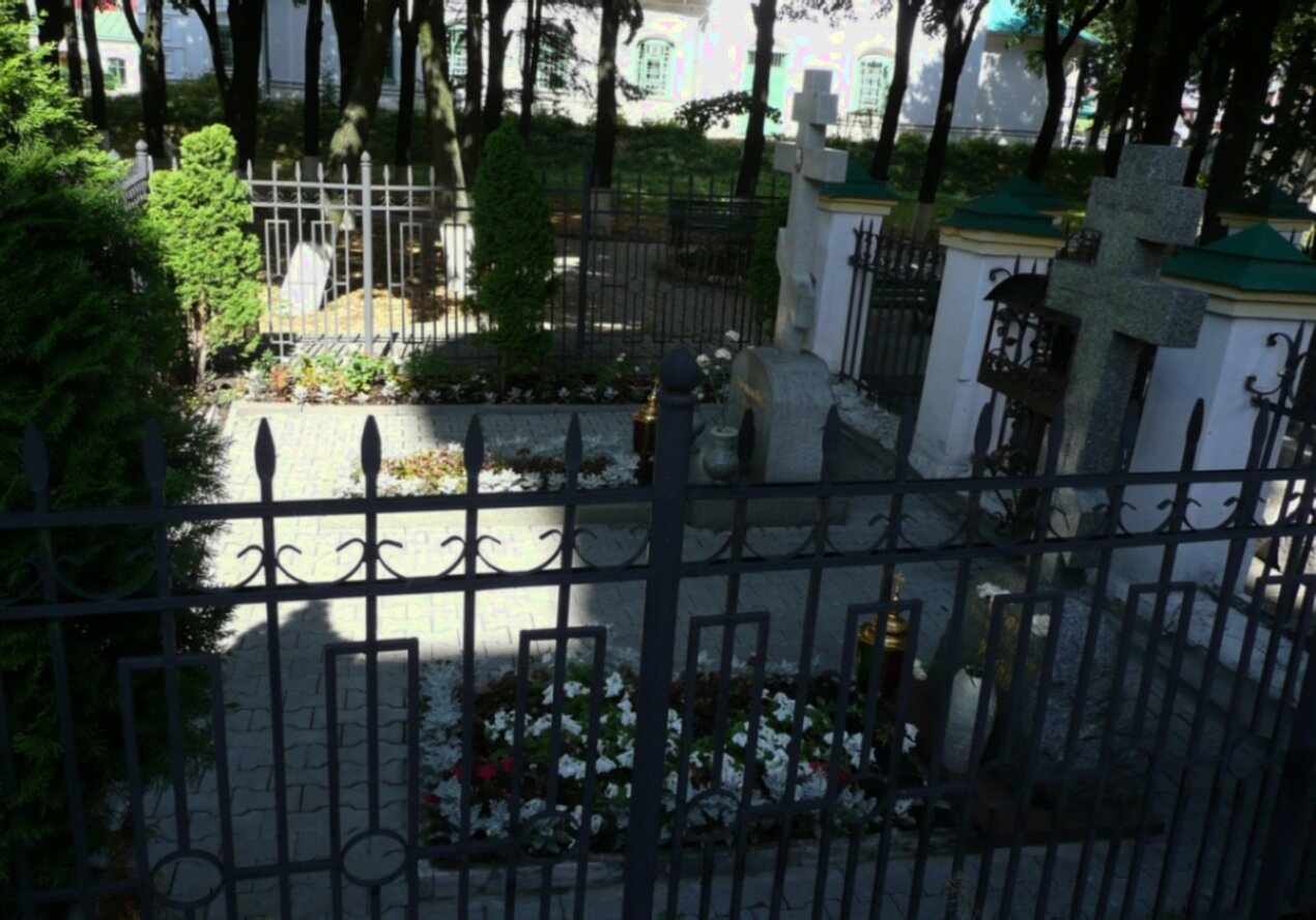 На переднем плане изображен ухоженный церковный двор, обнесенный кованой оградой. В пределах ограждения видны памятные надгробия и кресты, свидетельствующие о многовековой истории этого святого места. Особое внимание приковывает массивное каменное надгробие, вероятно, принадлежащее именитому горожанину или благотворителю храма. Между памятниками размещены цветочные композиции, что подчеркивает заботу прихожан о сохранении памяти усопших.