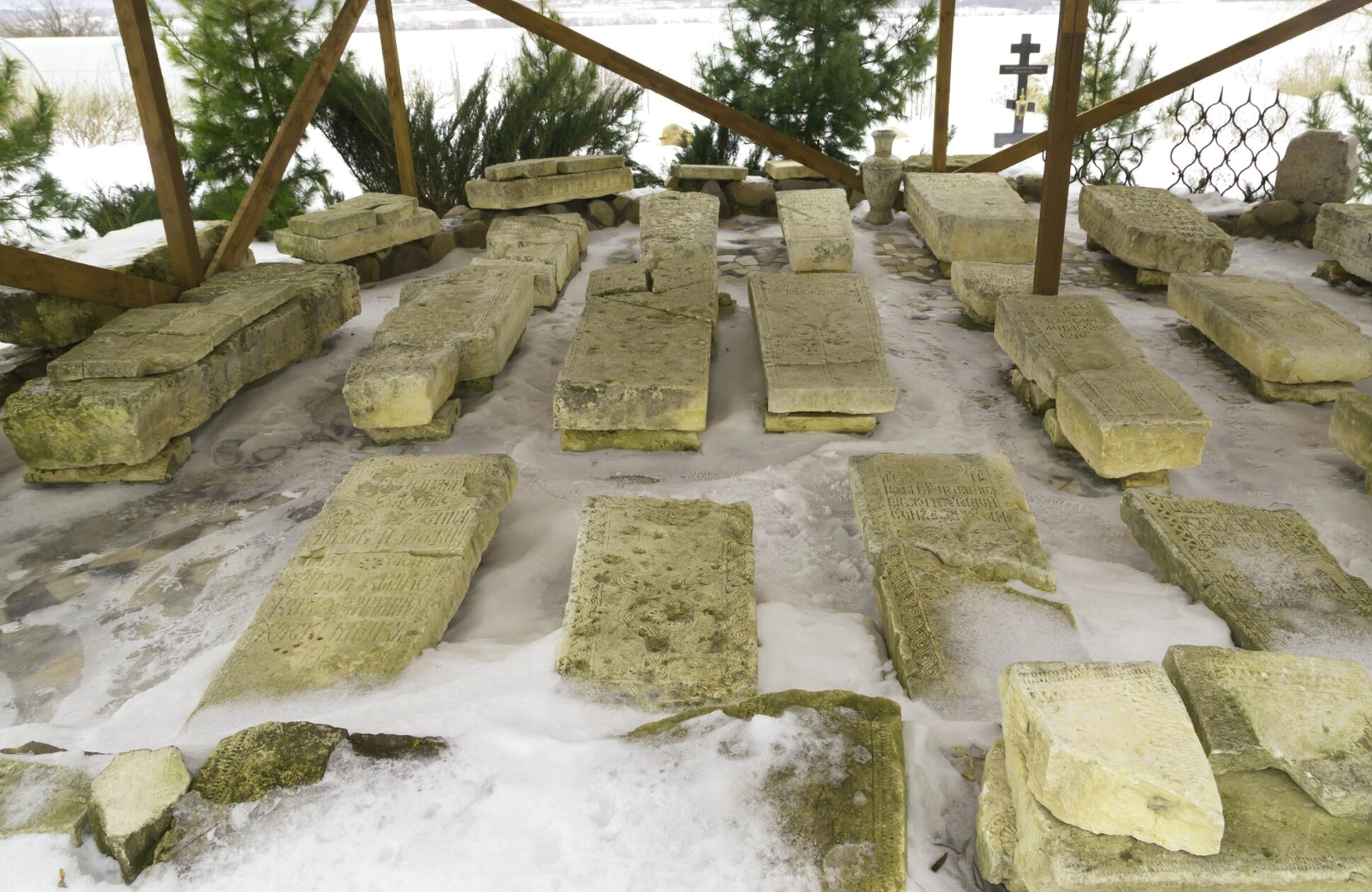 Величественные каменные надгробия и плиты, являющиеся немыми свидетелями нескольких столетий, покоятся под снегом. Эти намогильные памятники различной формы и размера принадлежат усопшим насельникам монастыря, благодетелям и почётным гражданам, обретшим здесь вечный покой. Многие плиты украшены резными Orthodox крестами и старославянскими надписями, которые ныне, увы, постепенно стирает время.