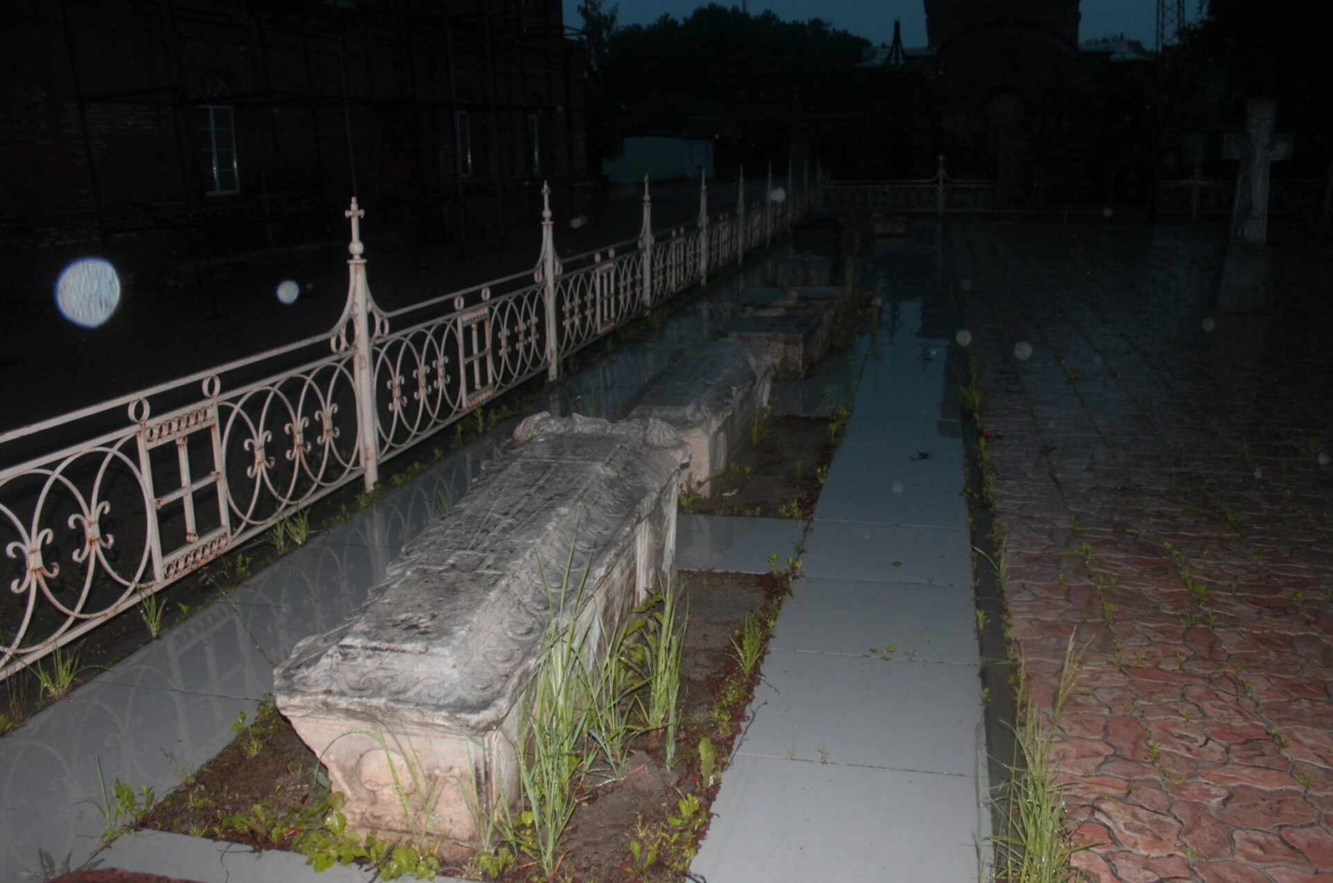 На представленной фотографии запечатлён участок исторического некрополя Калужского Свято-Лаврентьева мужского монастыря, сделанный в сумерках. В благоговейной тишине, озарённой мягким светом, предстают древние каменные саркофаги и надгробные плиты, окружённые кованой оградой с благочестивыми узорами. Эти намогильные памятники являются молчаливыми свидетелями нескольких веков русской православной истории, храня память о почивших насельниках монастыря и благочестивых мирянах, упокоившихся на освящённой земле.