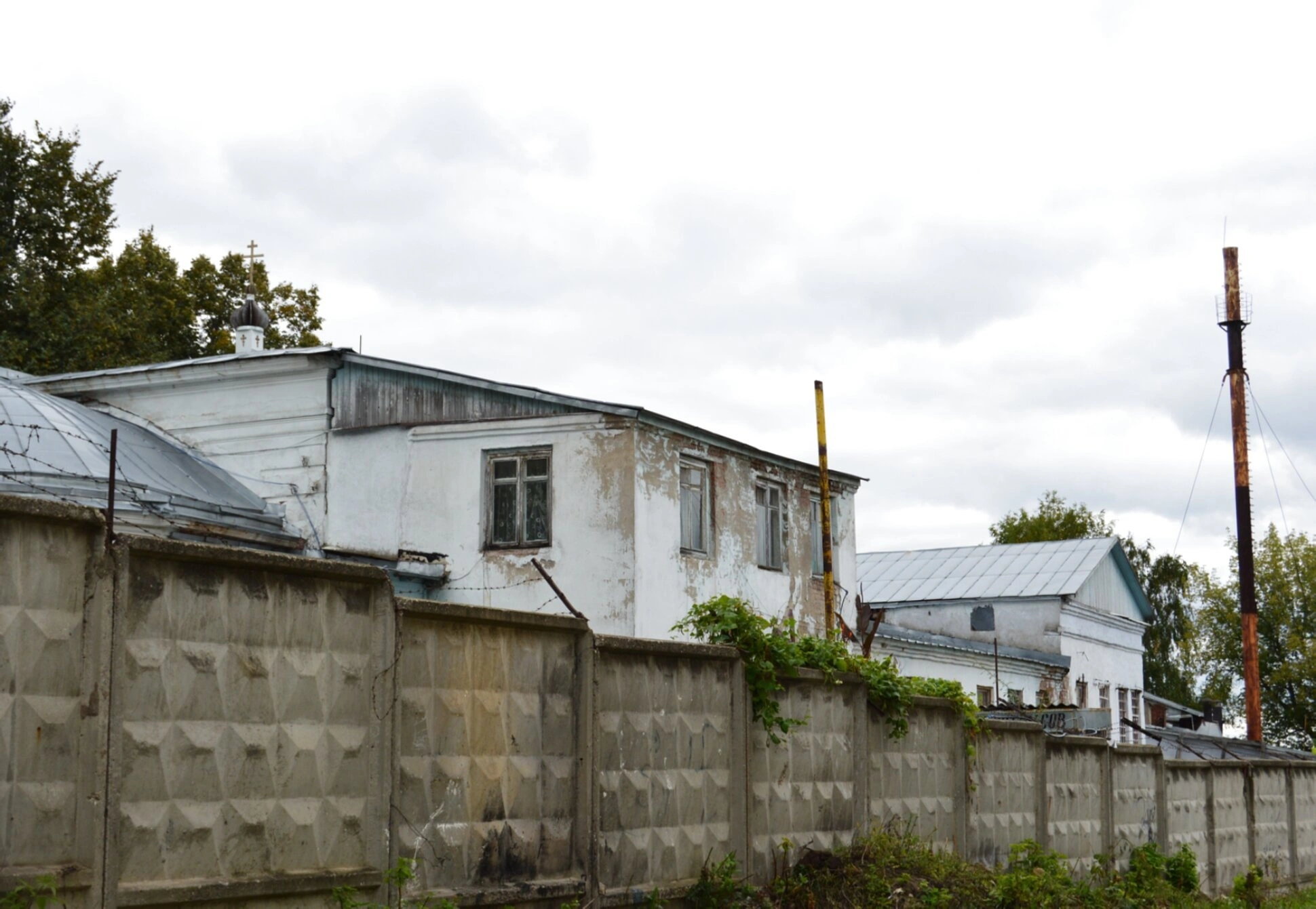 На переднем плане изображён массивный монастырский забор, выполненный из бетона и украшенный рельефным узором. Сверху ограждения видна колючая проволока, что свидетельствует о непростой истории обители в годы гонений на Церковь. За оградой открывается вид на одно из монастырских зданий, вероятно, жилой или хозяйственный корпус. Стены здания выкрашены в традиционный белый цвет, однако на них заметны следы облупившейся штукатурки, говорящие о необходимости реставрационных работ.