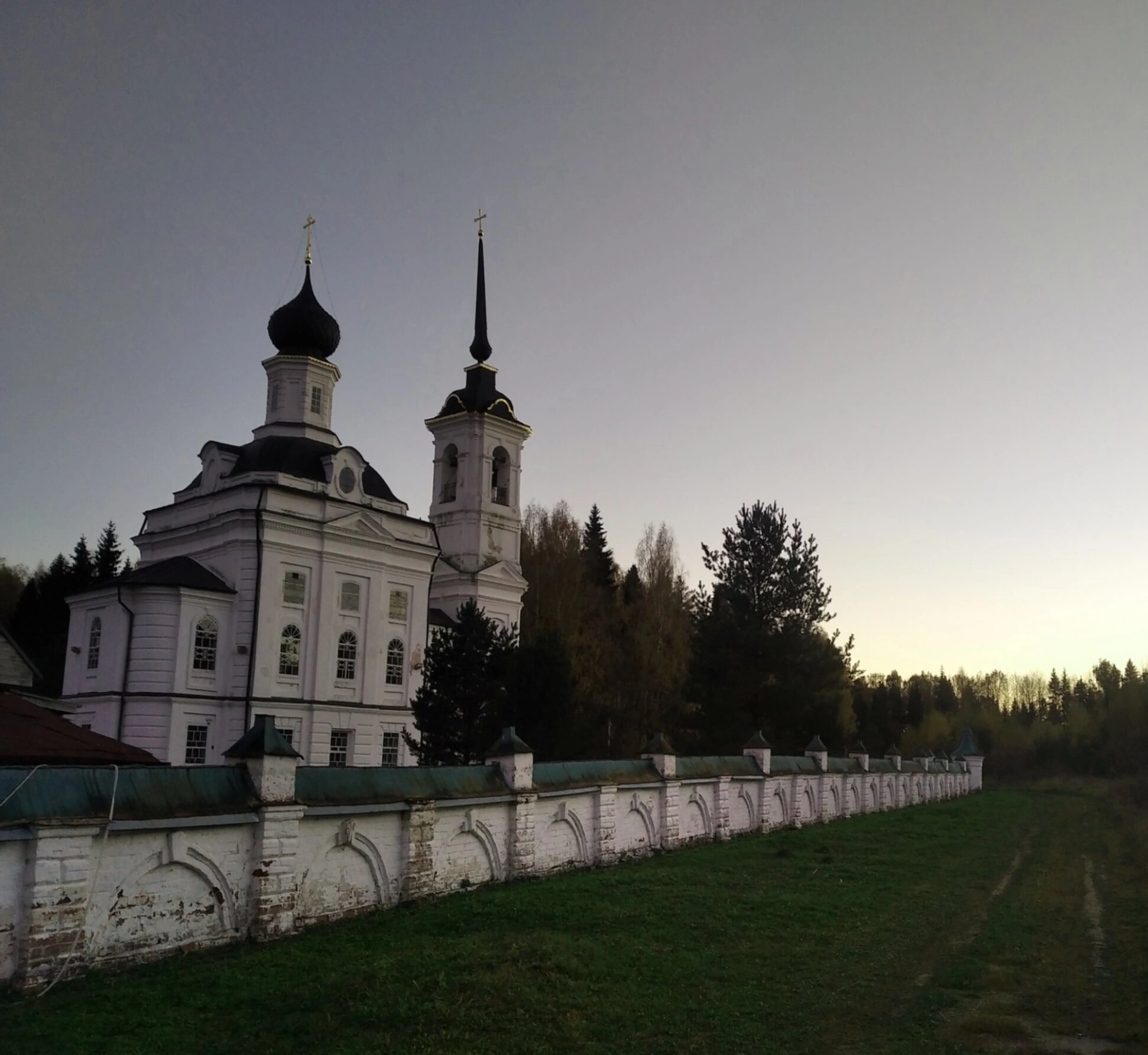 На представленной фотографии запечатлена старинная Николаевская церковь, расположенная в историческом погосте Бережки, что в Костромской области. Храм освящён во имя святителя Николая Чудотворца, одного из наиболее почитаемых святых на Руси. Снимок выполнен в удивительное время суток — на закате, когда небо окрашивается в мягкие, пастельные тона, создавая ореол божественного света вокруг святой обители.