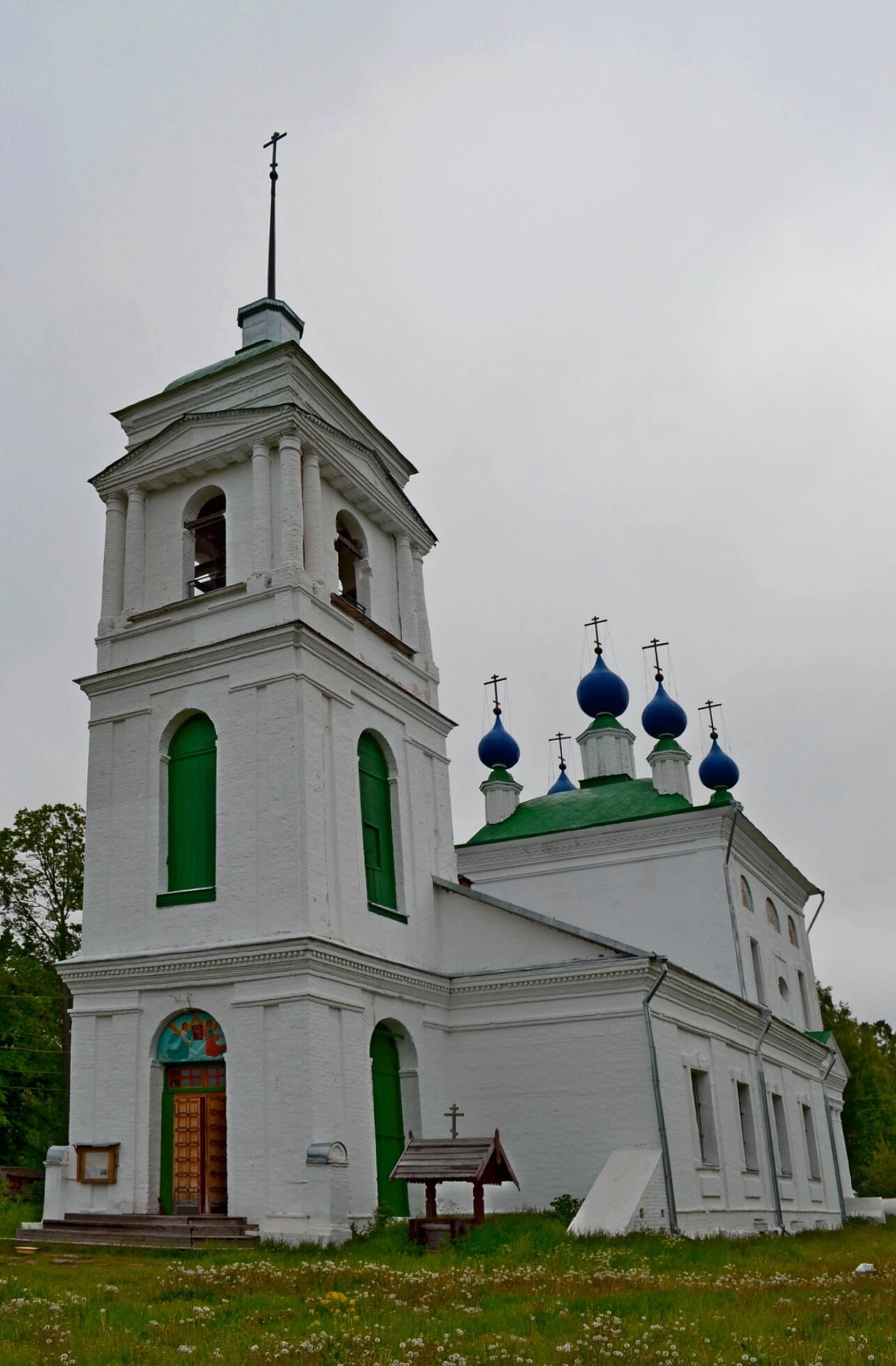Белоснежные стены храма, символизирующие чистоту и святость, гармонично сочетаются с ярко-зелёной кровлей и синими главами, увенчанными златыми крестами. Над основным объёмом возвышается стройная шатровая колокольня, которая придаёт всему ансамблю устремлённость ввысь, к небесам. Лаконичность и величие архитектурных форм свидетельствуют о традициях церковного строительства в русских губерниях.