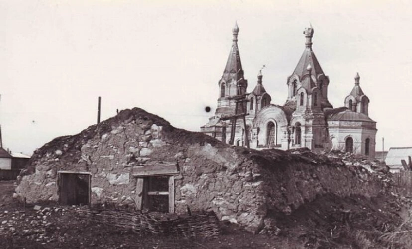 На переднем плане фотографии контрастно располагается простое земляное сооружение, возможно, являвшееся временным укрытием или хозяйственной постройкой. Этот композиционный приём символически противопоставляет вечное и бренное, горнее и земное, подчёркивая духовное величие храма Божия, который был центром жизни для казаков станицы Голубинской.