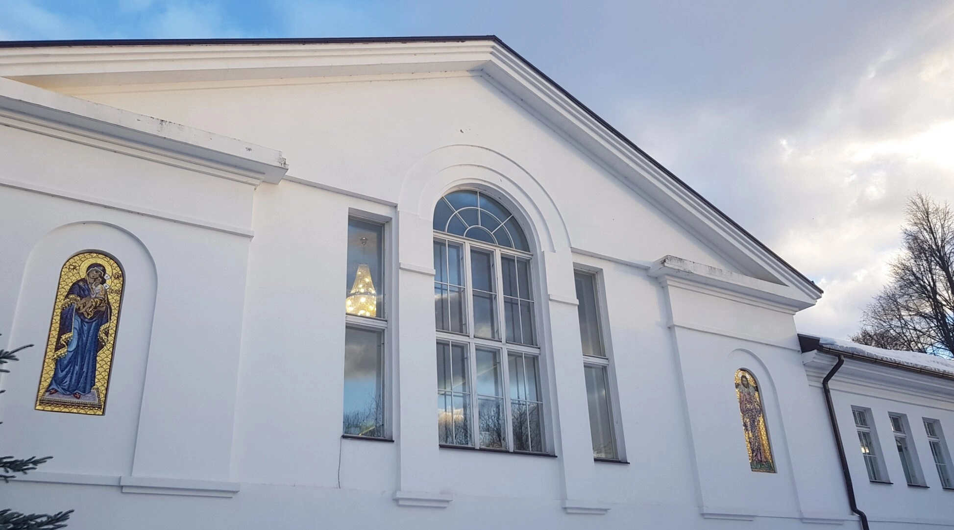 На снимке изображен фасад одного из храмовых сооружений обители, отличающийся благородной строгостью форм и духовной насыщенностью внешнего убранства. Белоснежные стены символизируют чистоту и святость этого места, а гармоничное сочетание арочных и прямоугольных оконных проемов создает особый ритм церковной архитектуры.