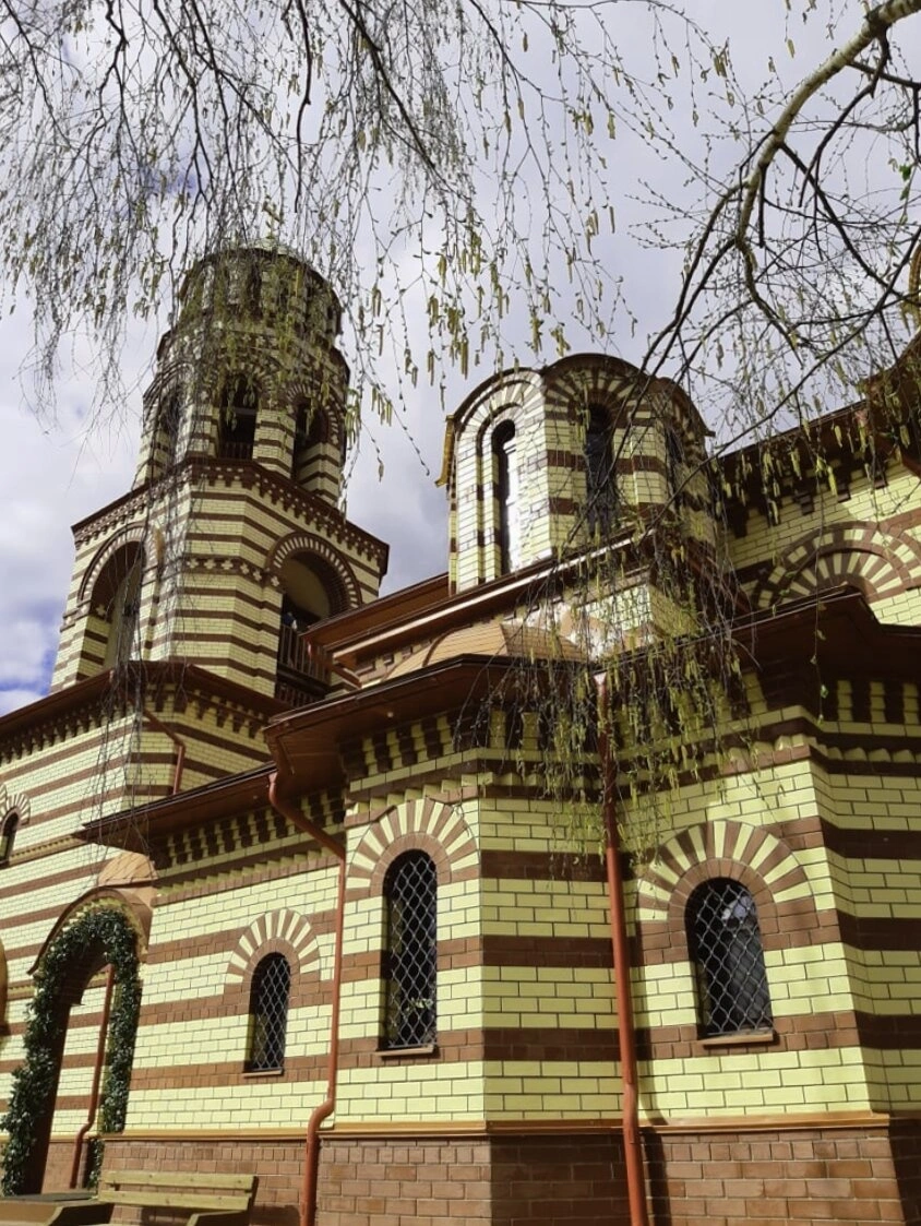 Архитектурный ансамбль монастыря, возрожденный в конце XX века после decades запустения, демонстрирует характерный для церковного зодчества стиль. На снимке хорошо просматривается монументальное кирпичное здание с выразительным декоративным оформлением в виде чередующихся полос красного и светлого камня. Высокая колокольня, увенчанная куполом, и арочные оконные проемы с коваными решетками подчеркивают величие православной святыни.