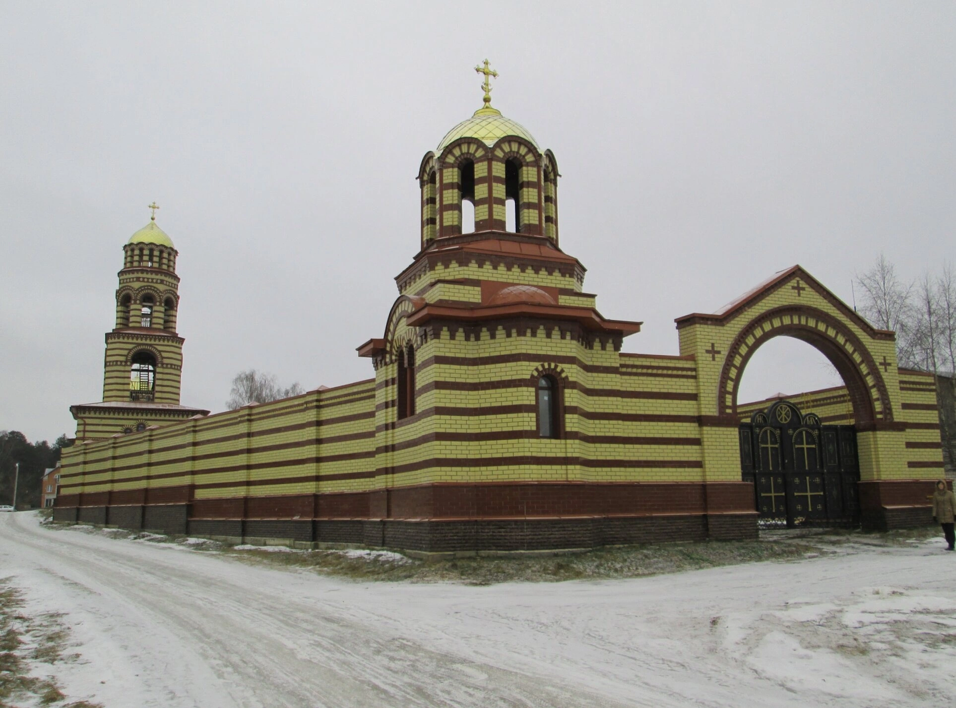 Архитектурный ансамбль монастыря представлен на фото главным храмом с золочеными куполами, увенчанными крестами, и высокой колокольней. Здания выстроены в традиционном русско-византийском стиле с характерным декоративным поясом из чередующихся рядов красного и желтого кирпича. Монастырская ограда с арочными воротами, выполненная в том же стиле, что и основные постройки, завершает образ замкнутой иноческой обители.