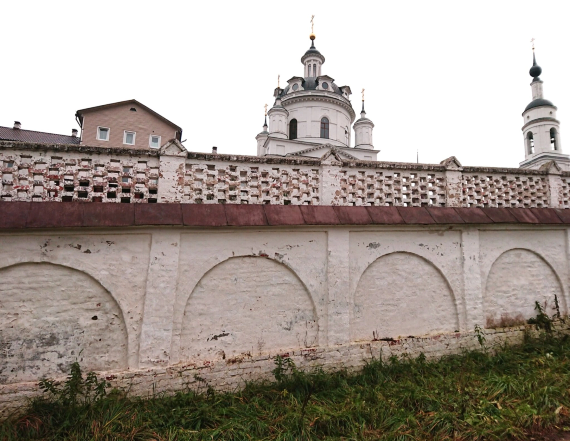 На переднем плане изображена монументальная белокаменная стена монастыря, характерная для русской храмовой архитектуры. В нижней части стены просматриваются глубокие арочные ниши, придающие сооружению особую архитектурную выразительность. Верхняя часть ограды украшена декоративной кирпичной кладкой со сквозными отверстиями, что создает эффект воздушности и легкости. У основания стены заметна обильная растительность, подчеркивающая исторический возраст сооружения.