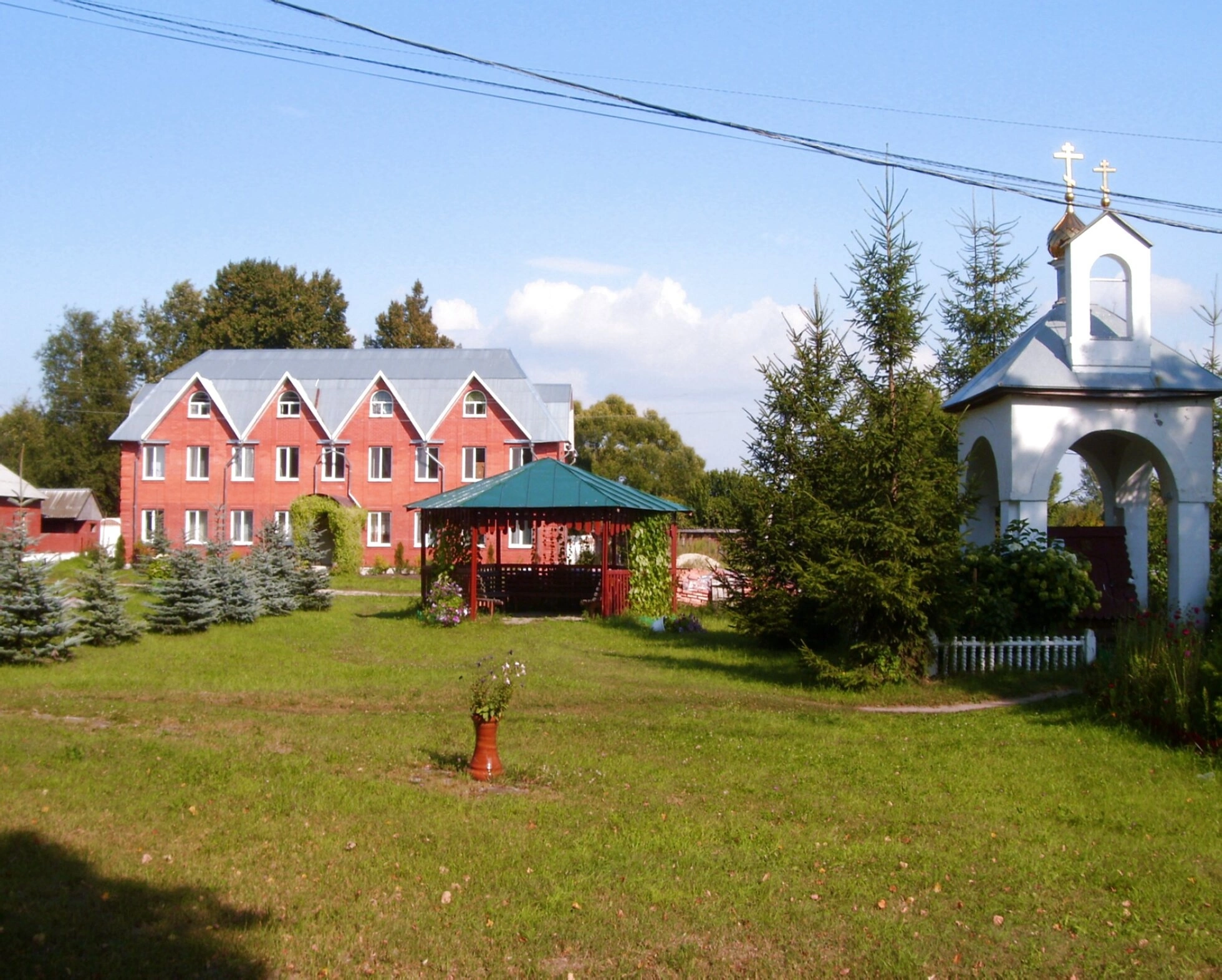 На переднем плане снимка располагается ухоженная монастырская территория. Слева виден кирпичный одноэтажный корпус, вероятно, предназначенный для братских келий или хозяйственных нужд. Его практичная архитектура характерна для монастырских построек XIX века. Центральным элементом композиции является изящная деревянная беседка, увенчанная зелёной кровлей. Подобные малые архитектурные формы создают особую молитвенную атмосферу уединения и покоя.