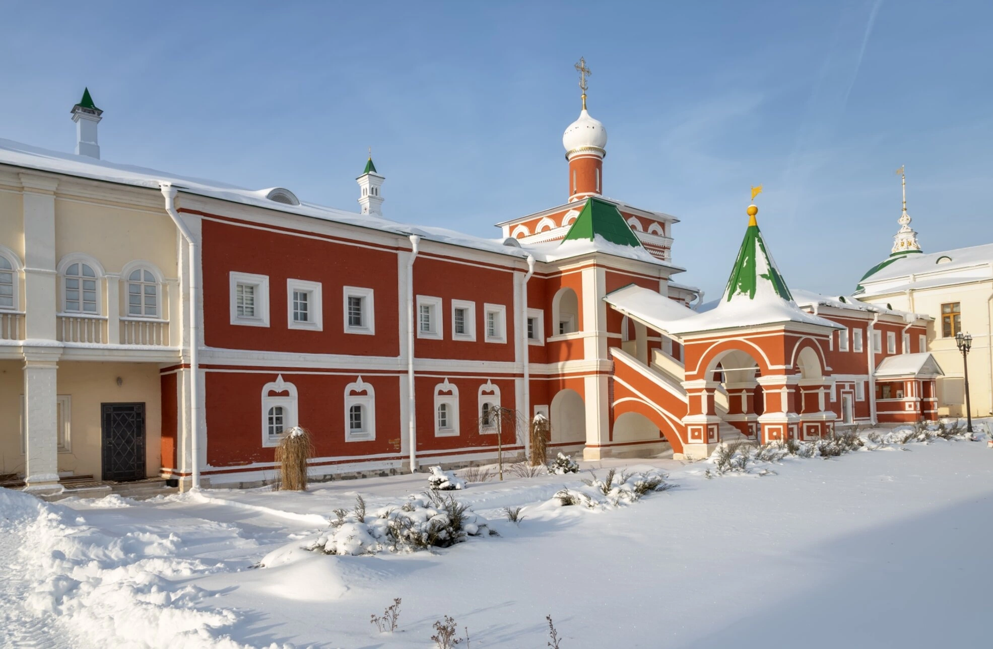 На переднем плане открывается вид на центральные здания монастырского ансамбля. Ярко-красное здание с белыми арочными окнами — это часть исторической застройки, вероятно, относящаяся к братским корпусам. Его крыльцо с лестницей, ведущей на второй этаж, покрыто снегом, что добавляет сцене умиротворённой строгости. Рядом возвышается небольшая башня с изящным белым куполом, увенчанным православным крестом, чей золотистый отблеск устремляется в небесную высь. Справа от неё виден шатёр зелёной кровли, характерный для архитектуры храмов XVII-XVIII столетий.
