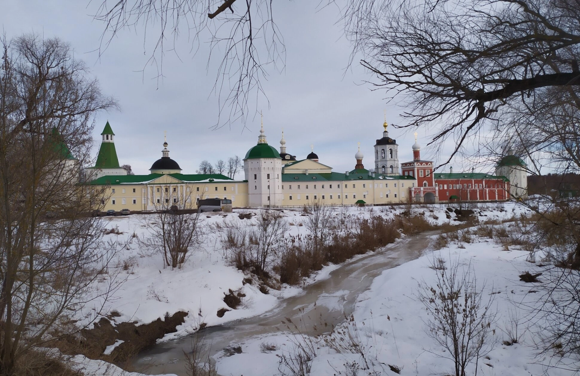 Комплекс монастырских зданий, окружённый высокой каменной оградой с башнями, возвышается на берегу реки Яхромы. На переднем плане виден частично замёрзший ручей или протока, чьи берега укрыты белым снегом. Голые ветви деревьев, сквозь которые сделан кадр, подчёркивают суровую красоту природы в ожидании весны. Архитектурный ансамбль, сложившийся в период с XVI по XIX столетие, демонстрирует храмы и корпуса с кремовыми стенами, зелёными скатными кровлями и сияющими на пасмурном небе куполами. Особое внимание привлекает здание с красными стенами, украшенными белым декором, и чёрными главками, создающее яркий контраст с общим строем.