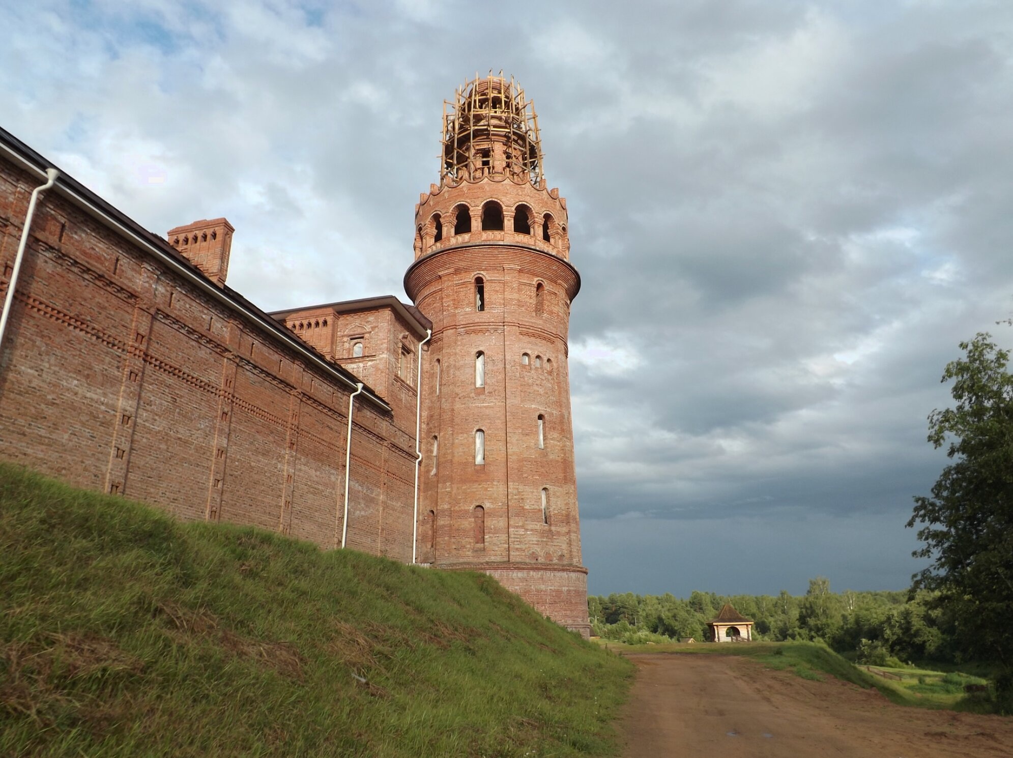 На снимке видна массивная башня монастырской стены, находящаяся под реставрационными лесами. Это свидетельствует о непрестанных трудах сестёр и благотворителей по восстановлению былого величия святой обители, которая была вновь открыта в 1994 году и с тех пор активно восстанавливается. Кирпичная кладка и мощные архитектурные формы говорят о традициях русского монастырского зодчества.