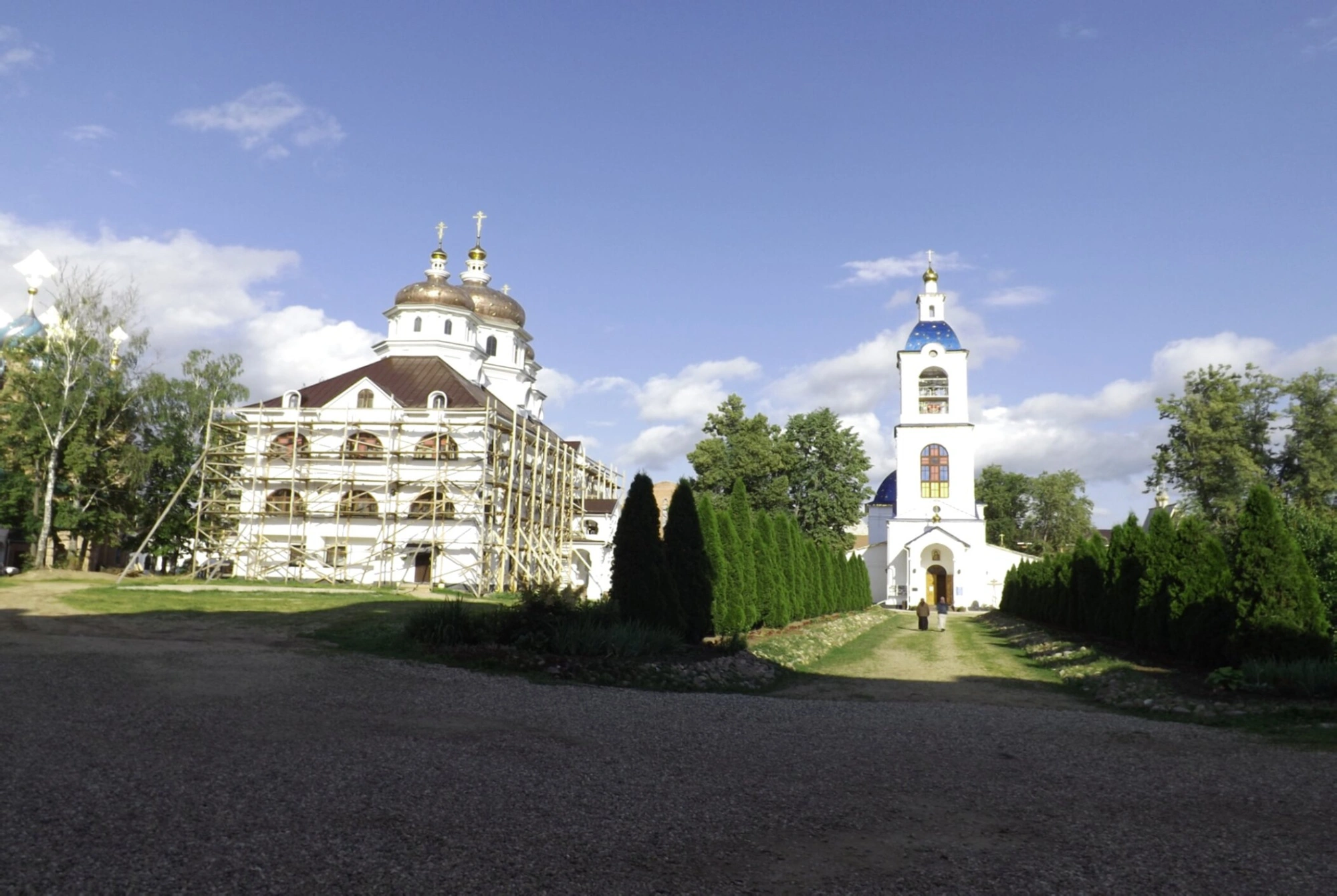 В центре композиции — главный собор обители, увенчанный златоглавыми куполами, которые устремляются ввысь, к небесам. В момент съёмки храм был окружён строительными лесами, что свидетельствует о непрестанных трудах по его восстановлению и украшению для славы Божией. Рядом возвышается стройная колокольня, чей ярусный силуэт и изящный шпиль являются классическим образцом русской церковной архитектуры. Её звон созывает насельниц и паломников на молитву.