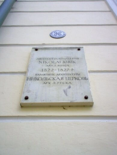 На представленной фотографии запечатлена мемориальная доска, установленная на стене Никольской церкви в столице Эстонии - городе Таллине. Эта информационная табличка свидетельствует о статусе храма как объекта культурного наследия, имеющего важное историко-архитектурное значение.