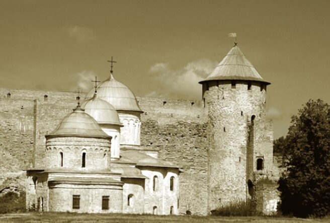 На представленной фотографии запечатлена Никольская церковь, расположенная на территории Ивангородской крепости в Ленинградской области. Этот православный храм, освящённый во имя святителя Николая Чудотворца, является выдающимся памятником русского церковного зодчества начала XVI столетия. Снимок выполнен в сепийной тональности, что придаёт ему особую атмосферу исторической достоверности и духовной сосредоточенности.