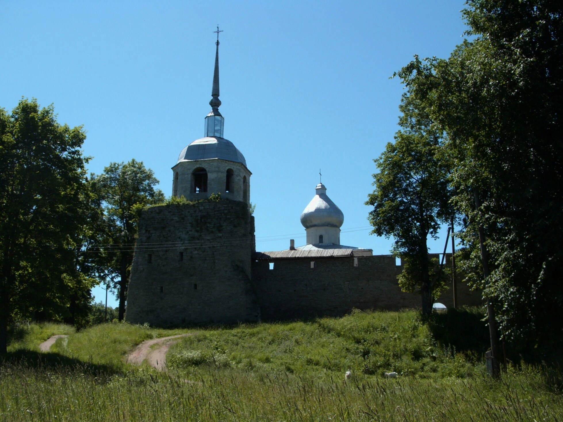 На представленной фотографии запечатлён величественный ансамбль Никольской церкви с колокольней, расположенный на территории древней Порховской крепости в Псковской области. Храм освящён во имя святителя Николая Чудотворца, одного из наиболее почитаемых святых в православной традиции.
