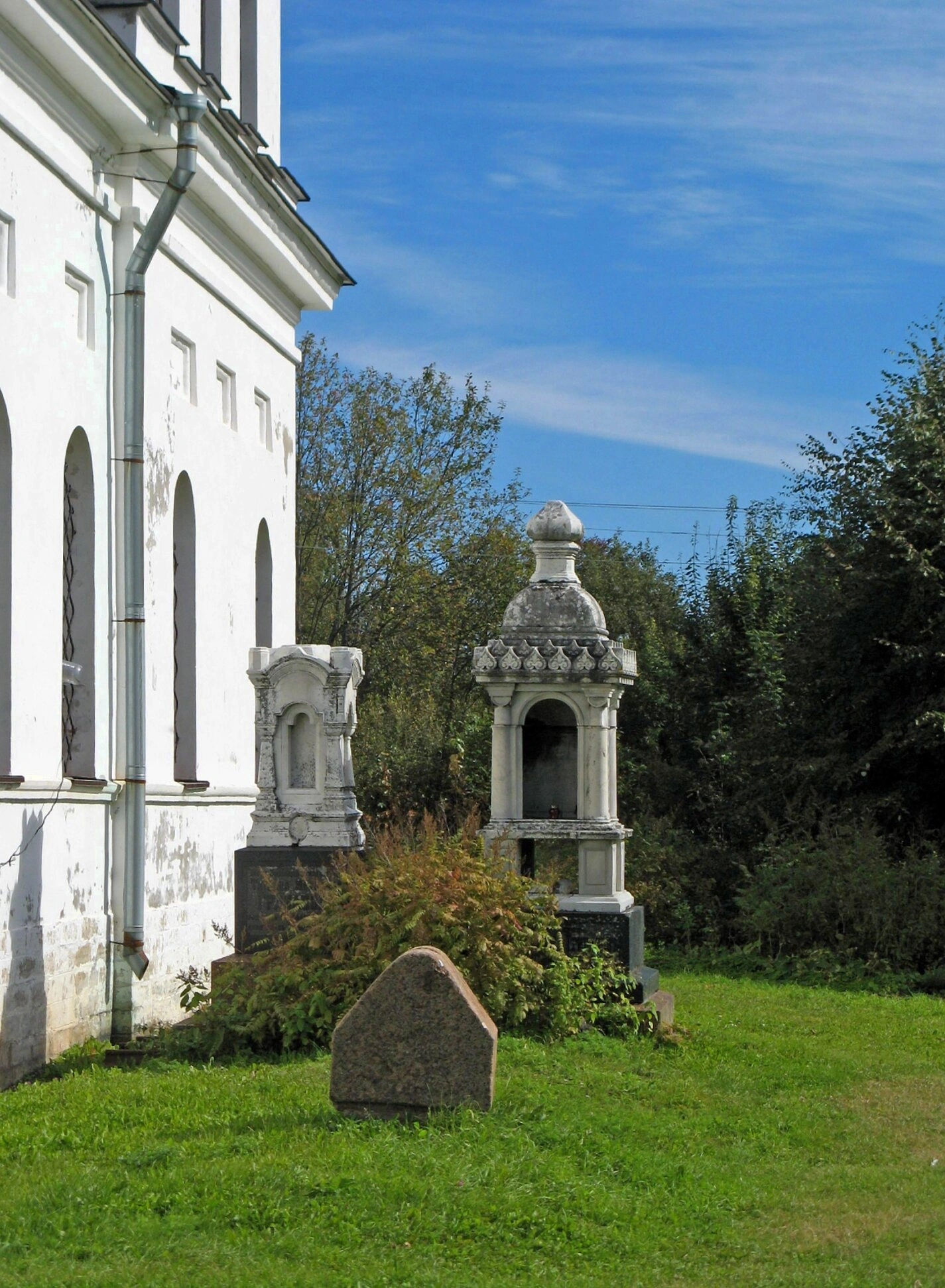 Перед храмом располагается ухоженная территория с зеленой лужайкой, где находятся исторические каменные надгробия и памятные камни, свидетельствующие о длительной истории этого святого места. Эти сооружения, вероятно, являются частью церковного некрополя, где нашли последнее пристанище благочестивые прихожане и благотворители храма.