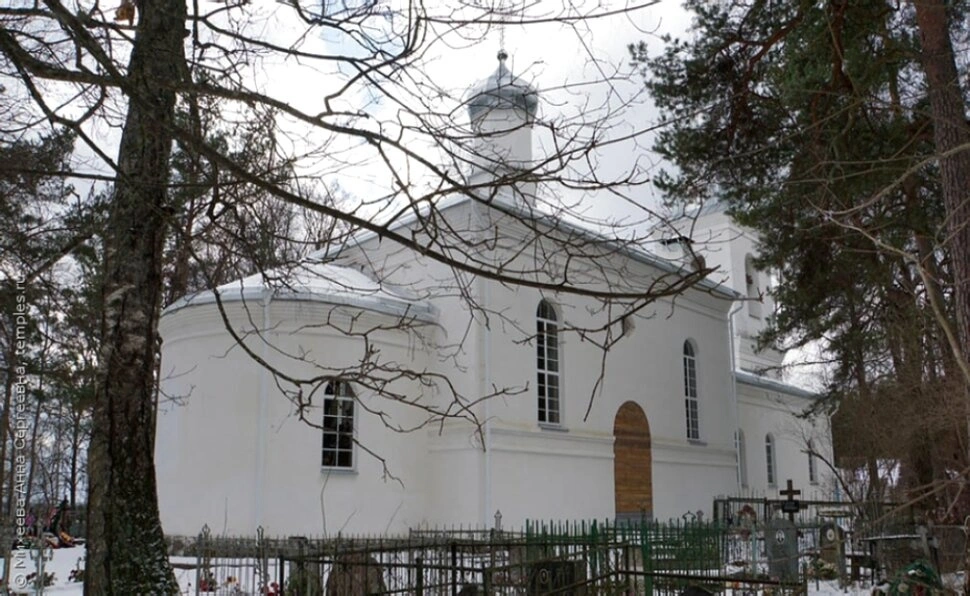 Святыня окружена хвойными деревьями и лиственными посадками с обнажёнными ветвями, создающими естественное обрамление архитектурного ансамбля. Перед храмом просматривается церковное кладбище с металлическими ограждениями и намогильными крестами, что добавляет месту особой духовной атмосферы.