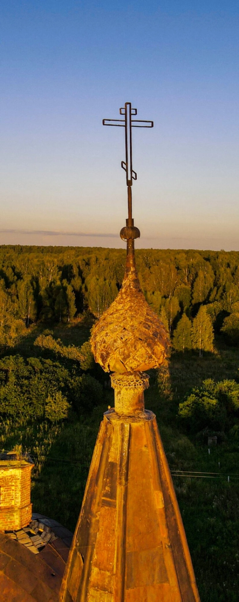 В центре композиции возвышается конический купол, увенчанный традиционным православным восьмиконечным крестом. Металлическое покрытие купола потемнело от времени и покрылось следами ржавчины, свидетельствуя о долгих годах запустения. У основания креста заметно крупное гнездо, свитое птицами, что символично подчеркивает нынешнее отсутствие постоянной богослужебной жизни в этом святом месте.