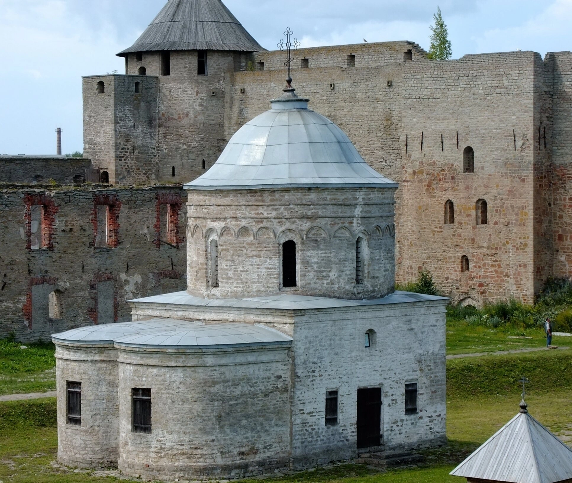 На фотографии запечатлена древняя Никольская церковь, расположенная на территории Ивангородской крепости в Ленинградской области. Этот храм является одним из старейших сохранившихся зданий всего крепостного ансамбля и имеет богатую историю, насчитывающую несколько столетий.