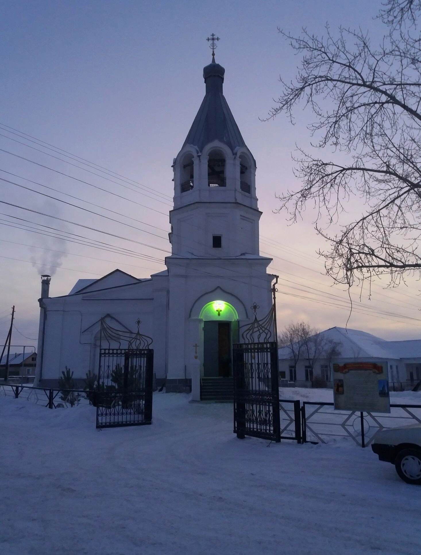 Снимок сделан в зимнее время в часы сумерек, когда мягкое вечернее освещение придает храму особую благоговейную атмосферу. Территория вокруг церкви покрыта нетронутым снежным покровом, что подчеркивает уединенность и покой этого святого места. Вход в храм освещен теплым светом, создающим ощущение духовного тепла и гостеприимства, что контрастирует с зимней стужей.