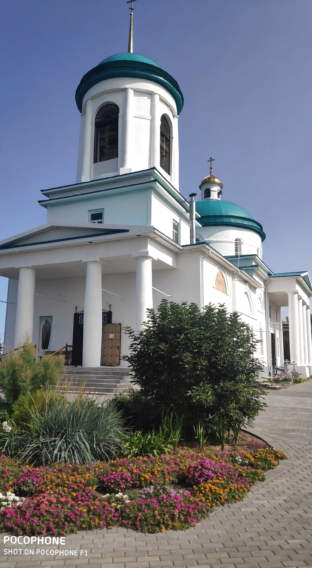 Вокруг церкви разбит ухоженный сад с цветочными клумбами и зелёными насаждениями, что создаёт особую атмосферу духовного уединения. Территория храма содержится в образцовом порядке, свидетельствуя о заботе прихожан о святом месте.